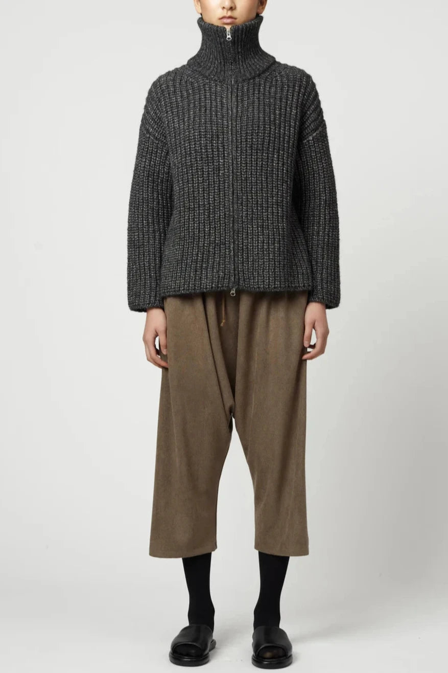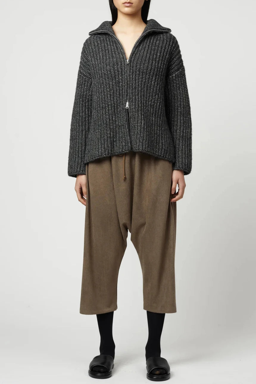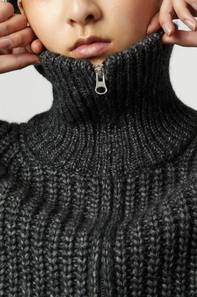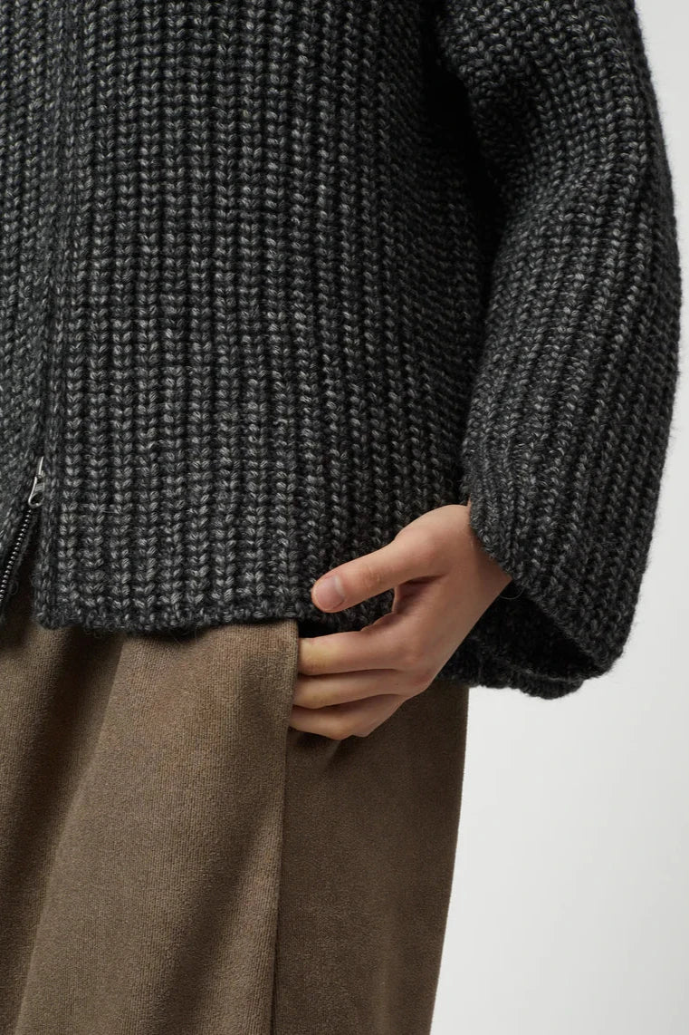 Chunky zip cardigan in our alpaca / pima cotton knit with a versatile two way zip for styling. Contrasting pima and alpaca yarns add breathability to the knit’s coziness as well as textural coloration.