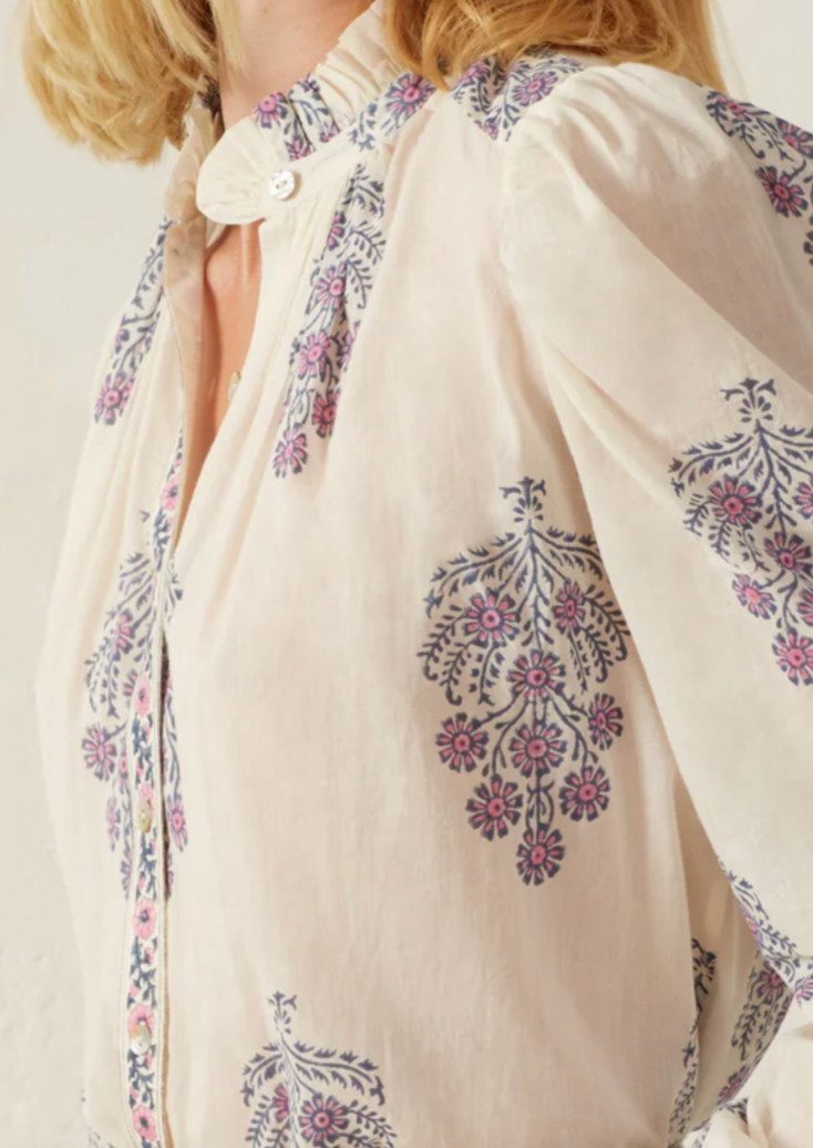 Individually cut by hand and finished with French seams, this floral motif shirt has long puffed sleeves, a ruffled collar, and a border-print front placket with mother-of-pearl buttons. Crafted in a cotton voile, the '70s vintage-inspired shirt has a semi-sheer texture perfect for warmer weather.