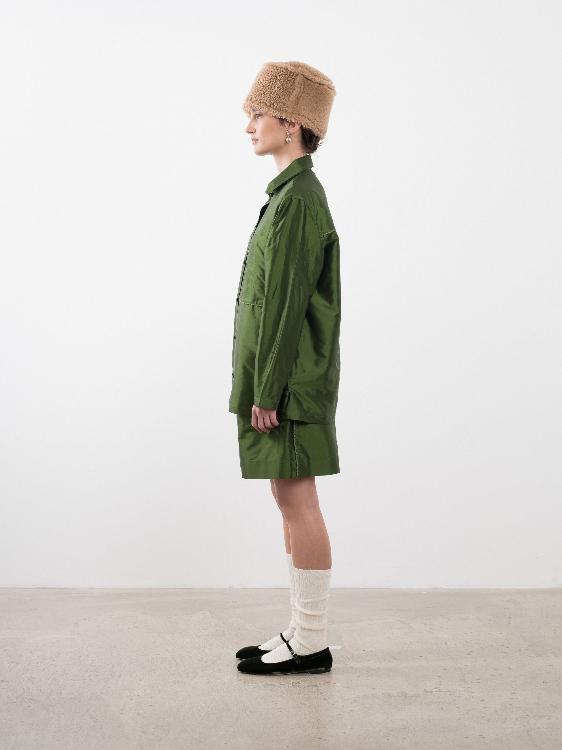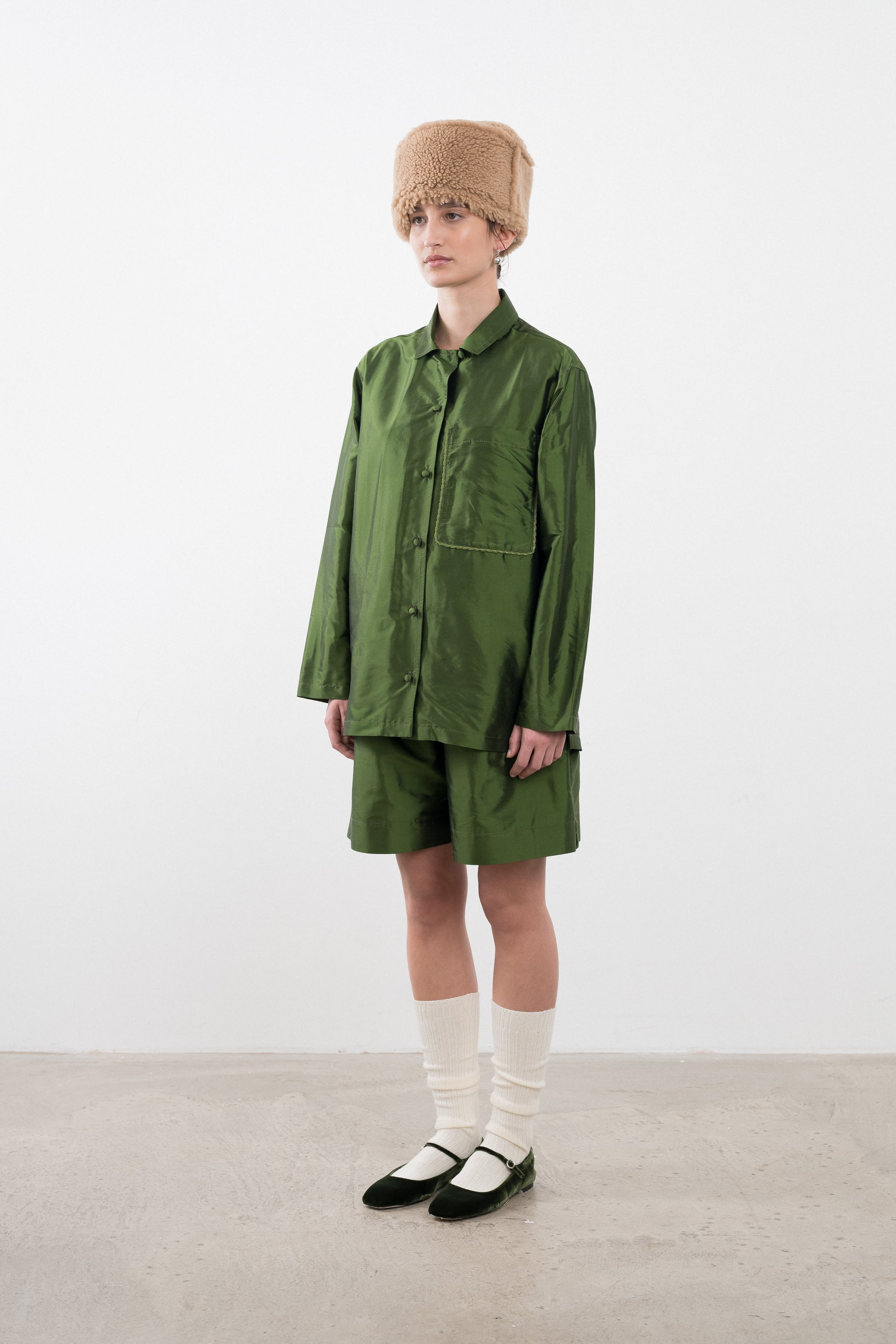 Made from 100% silk and finished with matching embroidered piping, this shirt features a relaxed, boxy fit with a notched collar, dropped shoulders, side slits at the hem, and a patch pocket at the chest. Wear it on its own or pair it with the coordinating Hilda Shorts for ultimate comfort and effortless style.