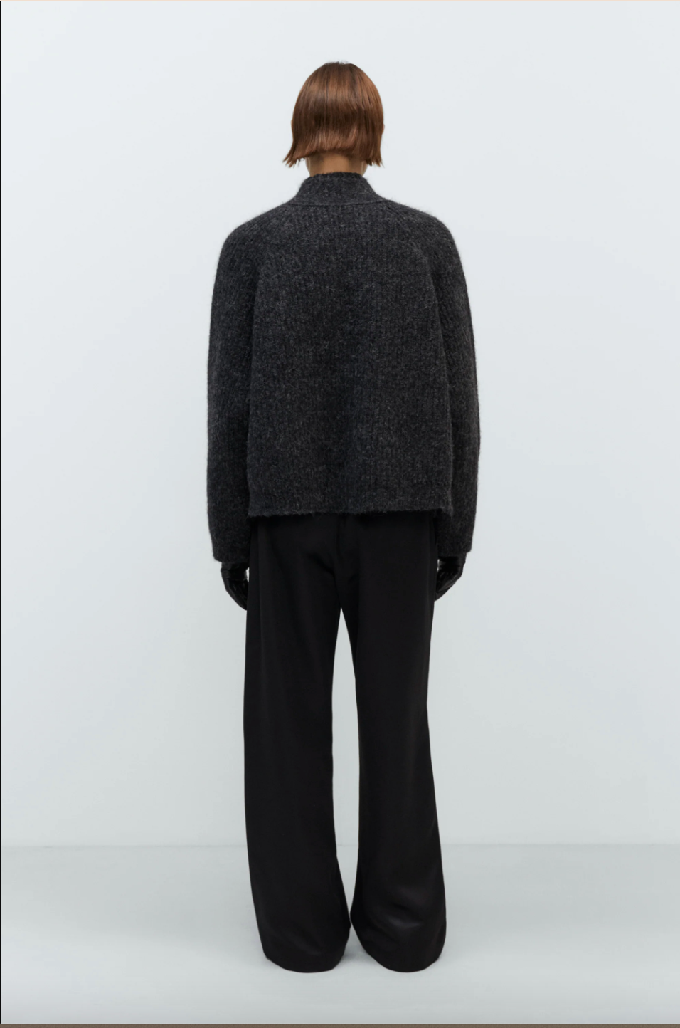 Lightweight, boxy oversized fit with side slits for added comfort. Front horn button closure and a V-shaped high collar. The mélange effect adds texture, enhancing the cardigan's unique style and warmth.