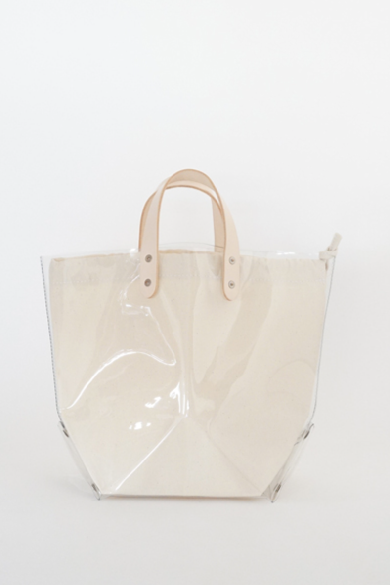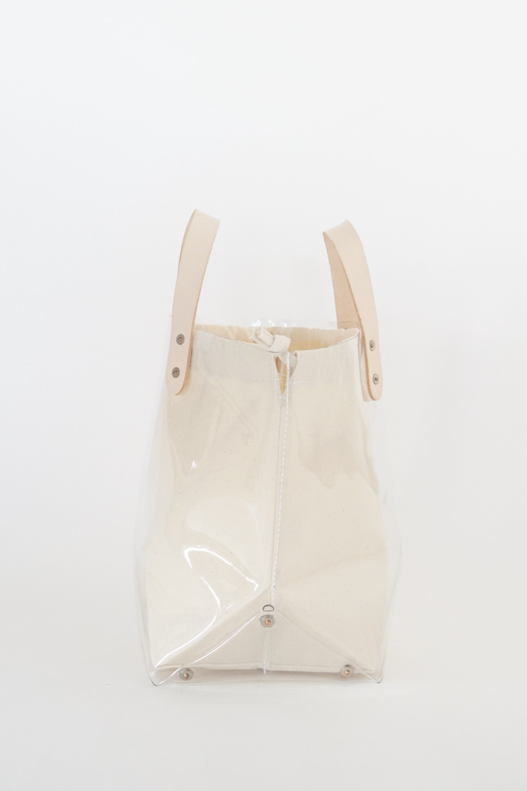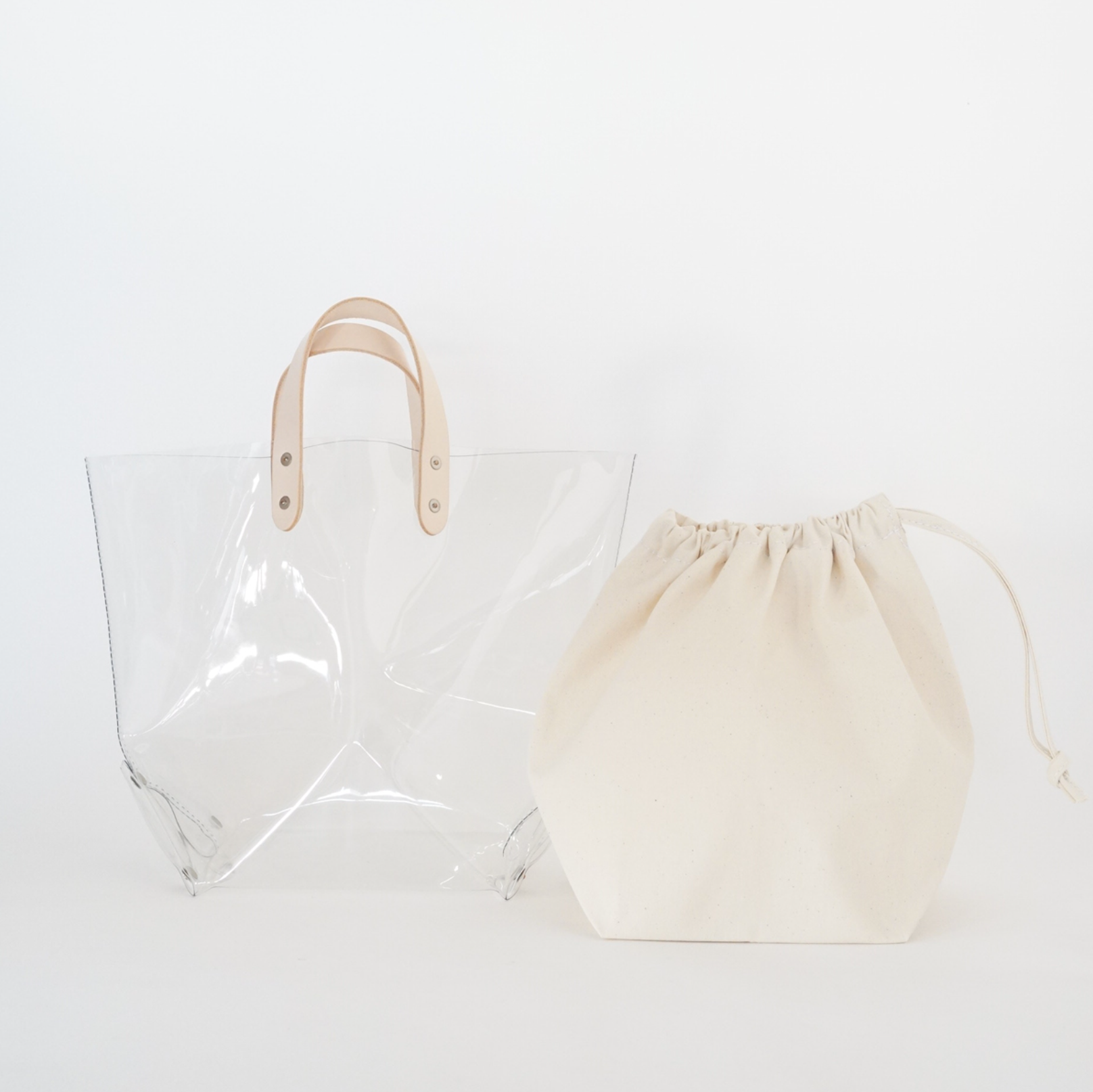 The outside of this tote is made of transparent PVC material, and the cotton drawstring inside is removable. This tote is made the with the old-fashioned method of hand-hammering each leather punch-type rivet, cutting off the tips, and polishing them. The tando leather handle will change its unique color and texture the more you use it.