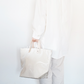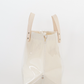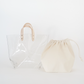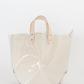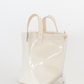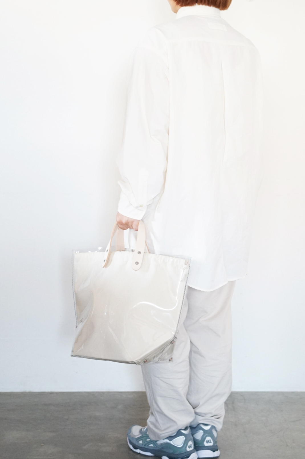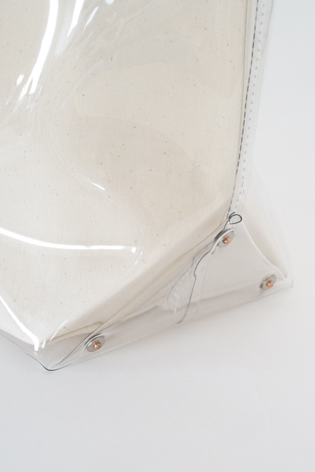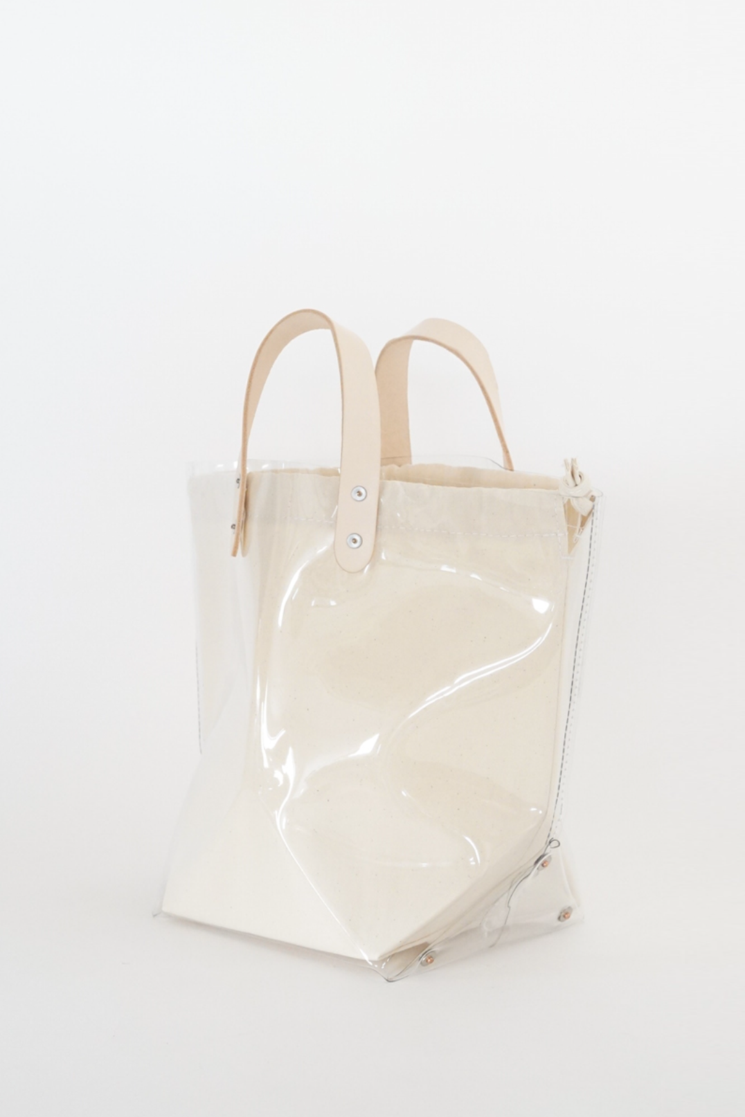 The outside of this tote is made of transparent PVC material, and the cotton drawstring inside is removable. This tote is made the with the old-fashioned method of hand-hammering each leather punch-type rivet, cutting off the tips, and polishing them. The tando leather handle will change its unique color and texture the more you use it.