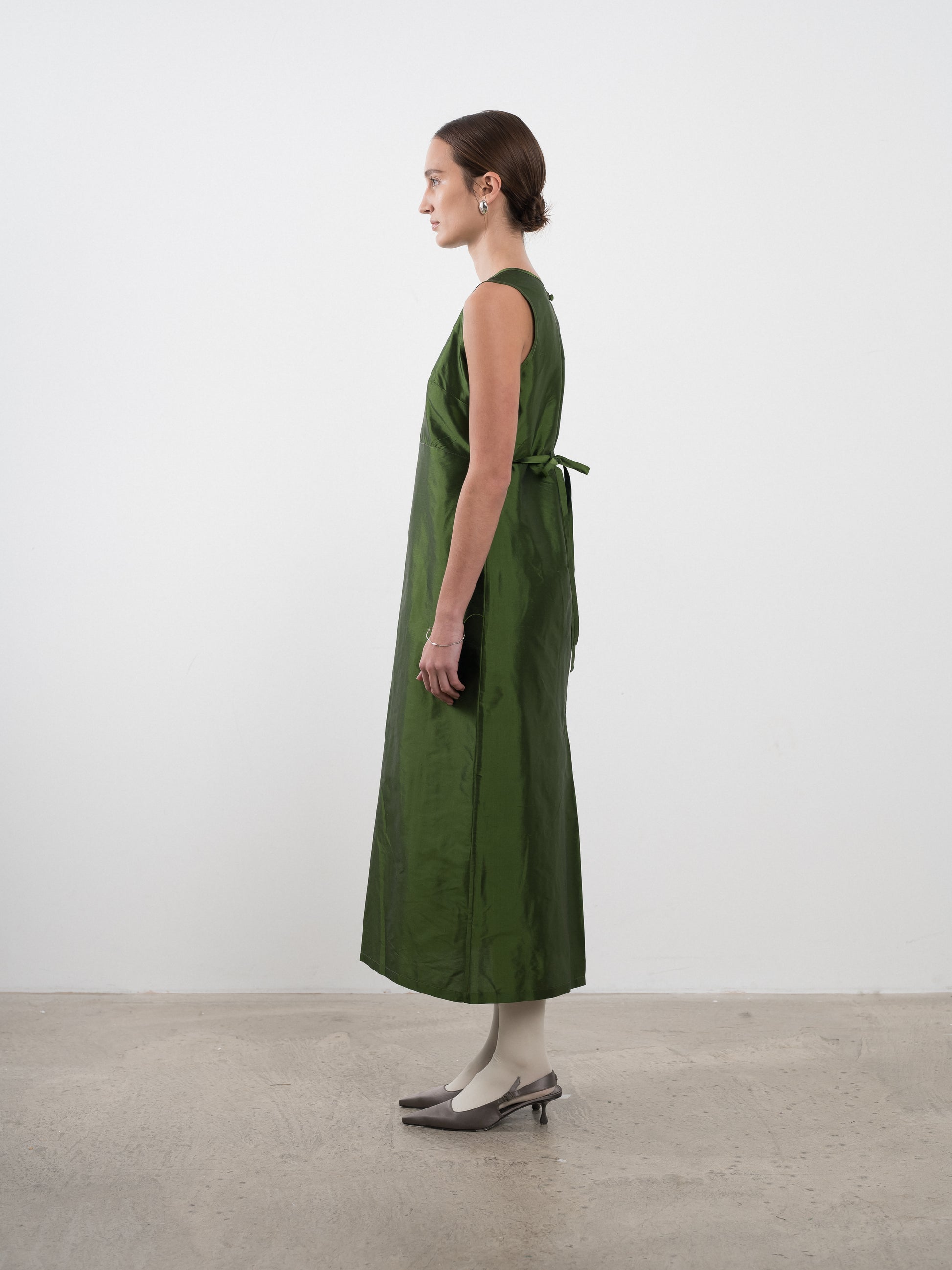New for AW25, the Erika Dress is crafted from luxurious silk dupion—ideal for special occasions or refined daily layering. Featuring a sleek, minimalist silhouette, it includes a waist tie for definition, a back hem slit for ease of movement, and a delicate shell button with a keyhole closure.