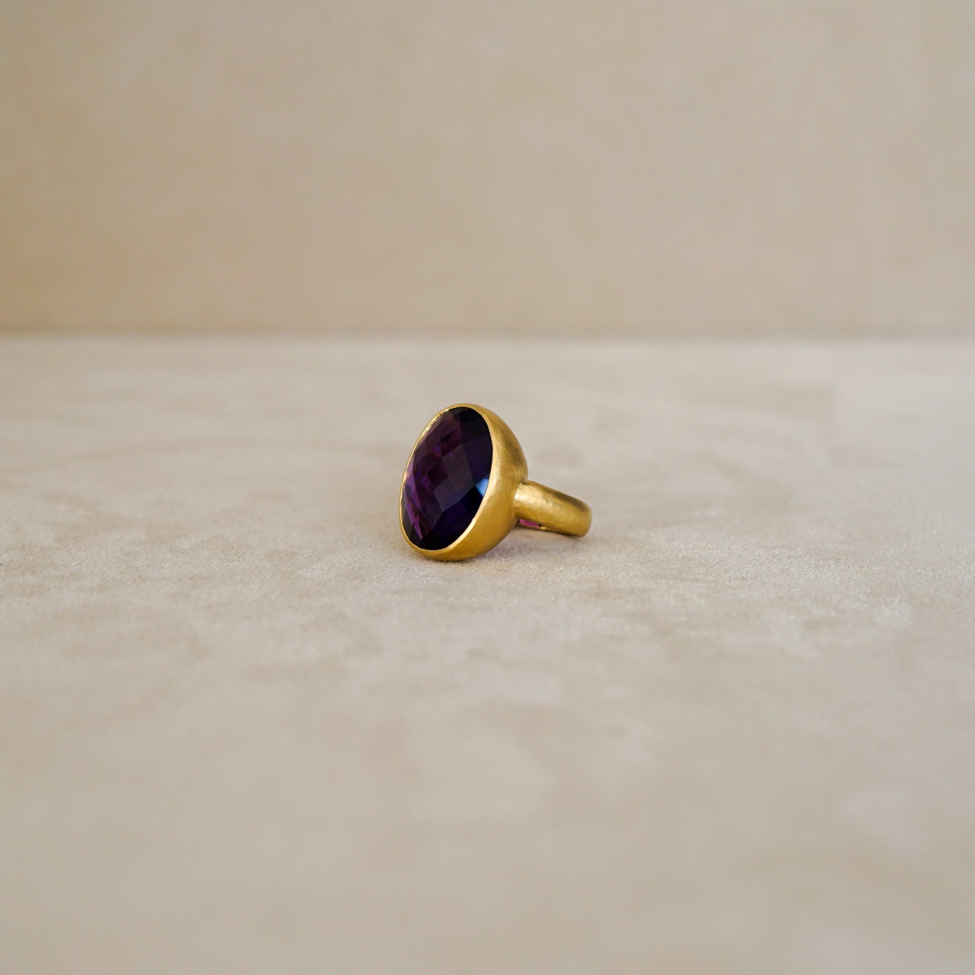 The Faceted Amethyst Ring features a 14.53 ct Amethyst and sculpted hand-hammered 18 Kt gold.