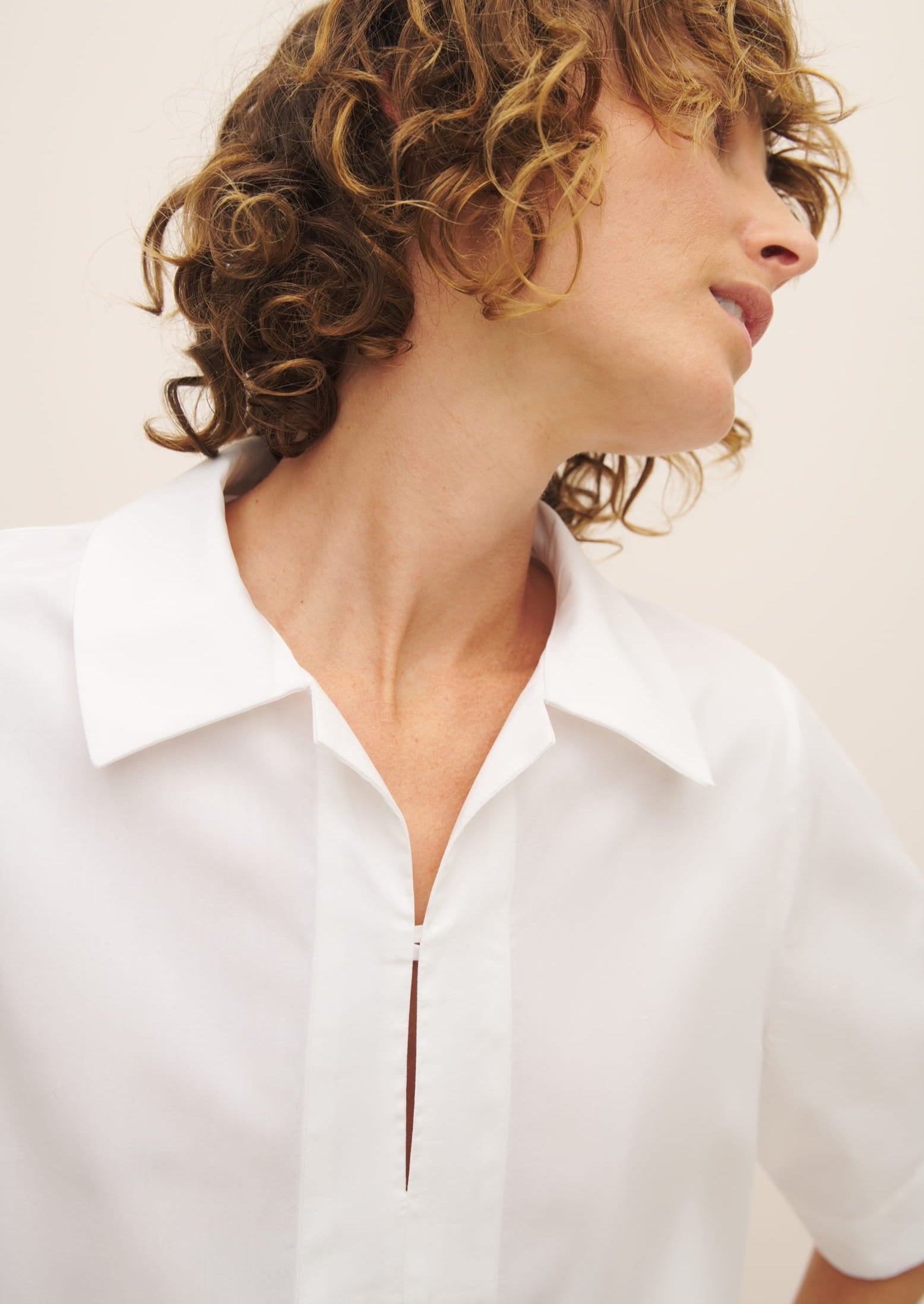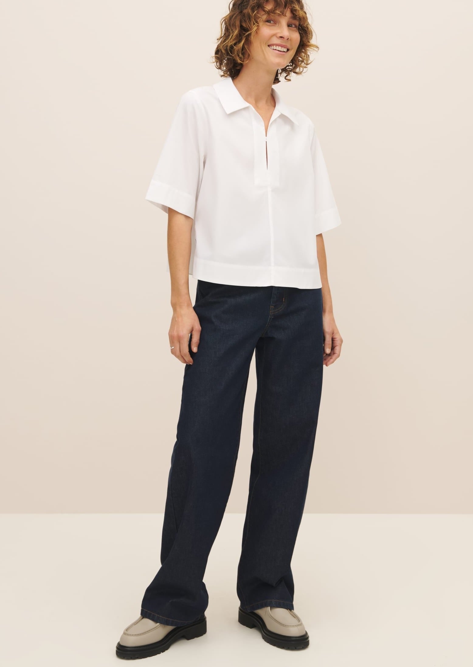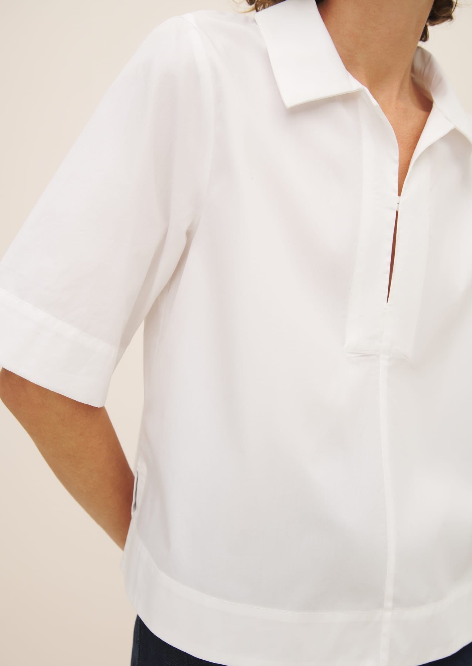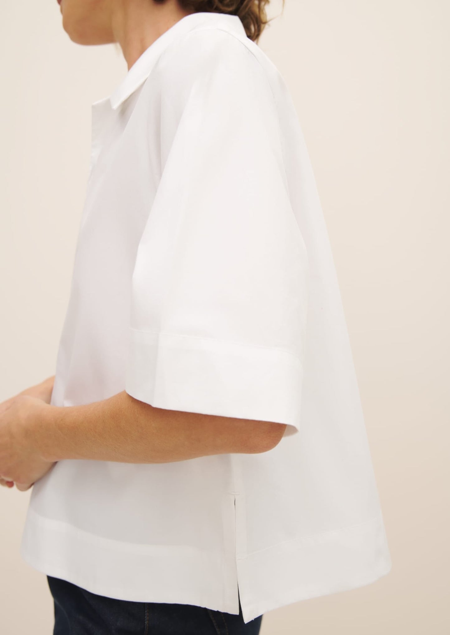 Made from 100% certified Fairtrade organic cotton poplin shirting, the Horizon Shirt is a crisp, modern iteration of the white shirt, defined by a naval inspired collar and placket. It has a standard fit with neat shoulders, and a slight A-line shape through the body with side splits for ease of wear. It features an internal agoya shell button closure. A twist on a classic for dressing up or down.
