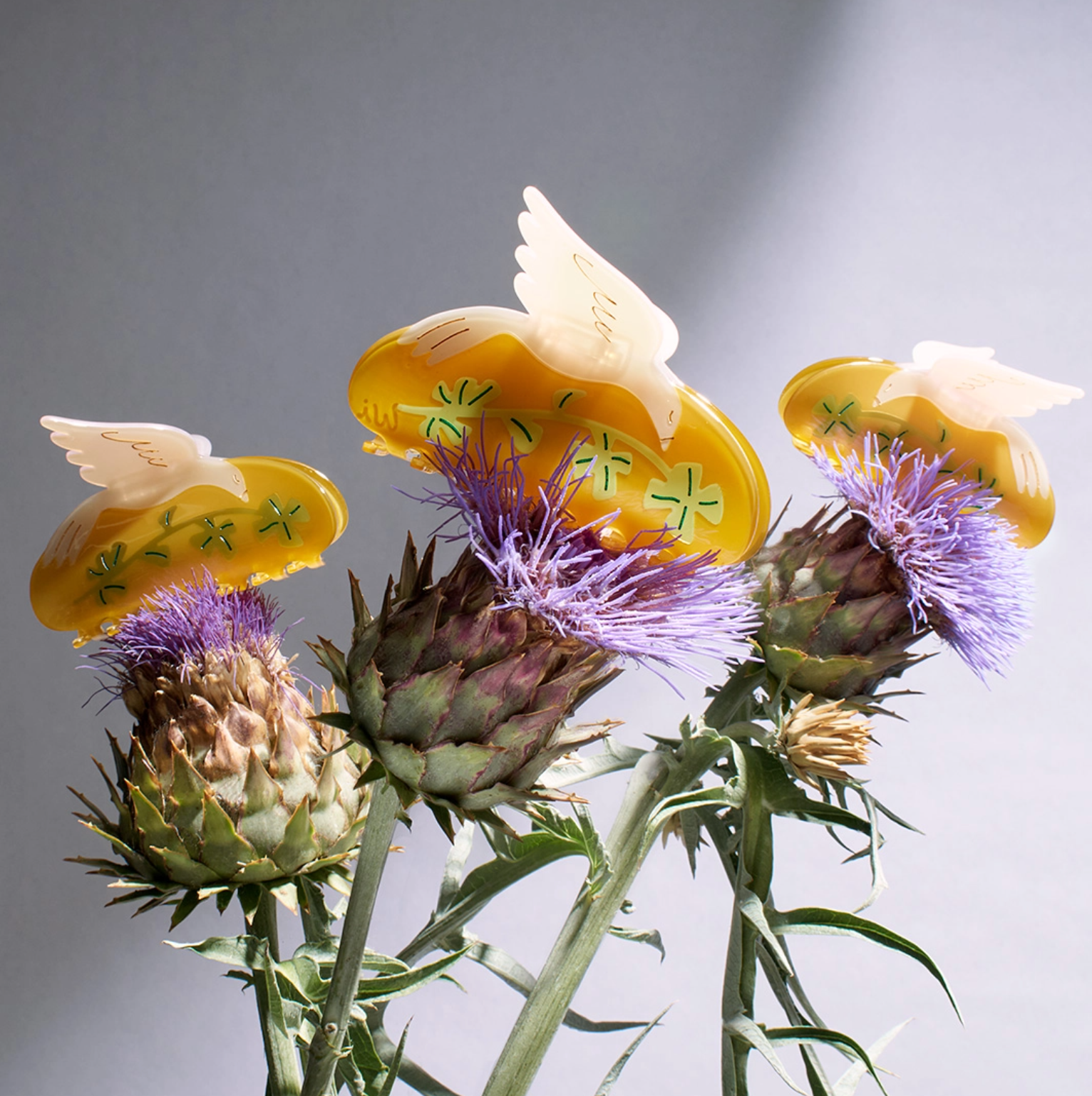 Los Angeles based artist Winona Irene draws inspiration from the natural world to create whimsical hair clips and claws in all shapes and sizes. Each hair claw is made of individually cut acetate pieces which may cause some minor variation.