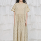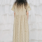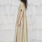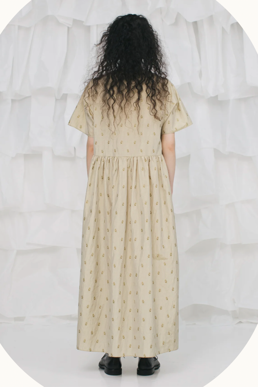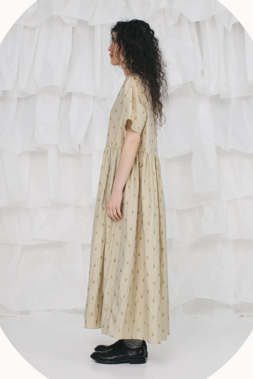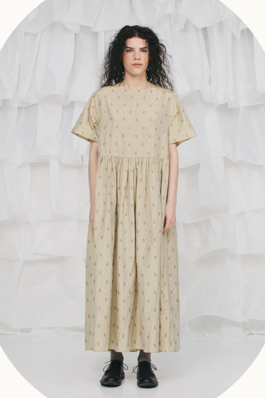 A stunning dress made from a technical tonal floral jacquard in gold. With a relaxed fit, gathered waist, and a mother-of-pearl button closure at the back of the neckline, it offers a touch of elegance. Lightweight yet not too sheer, this dress is perfect to wear on its own or layered under other pieces.