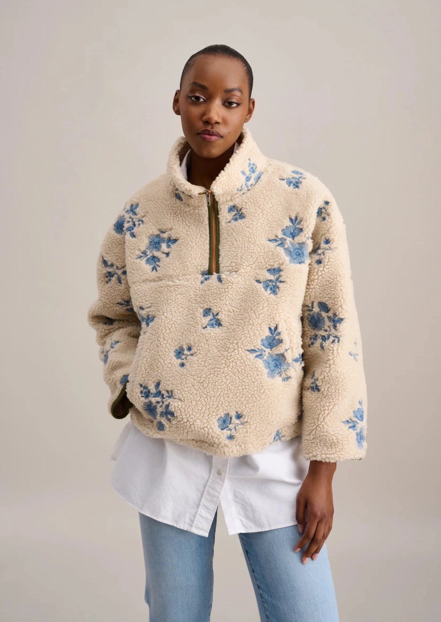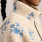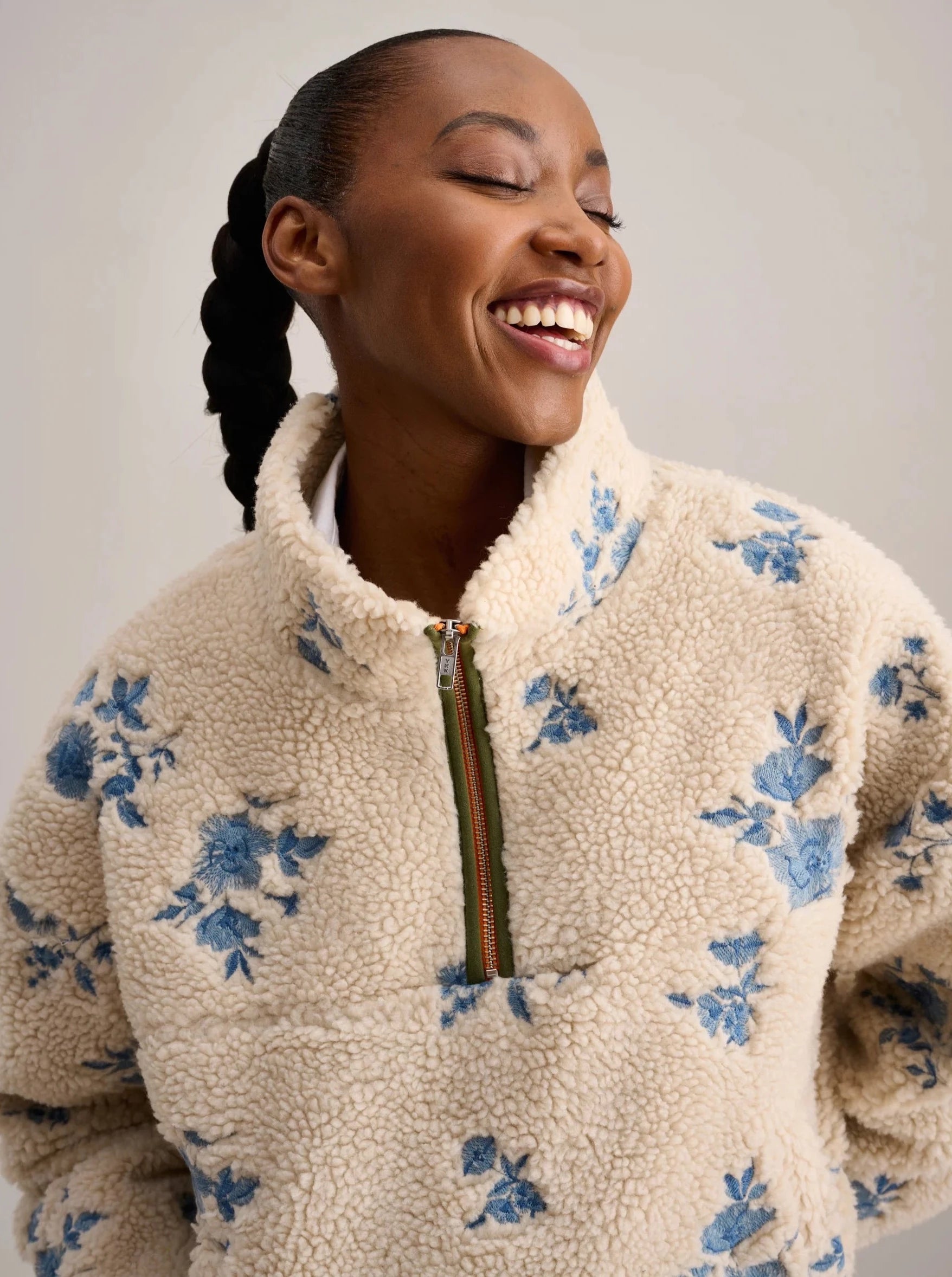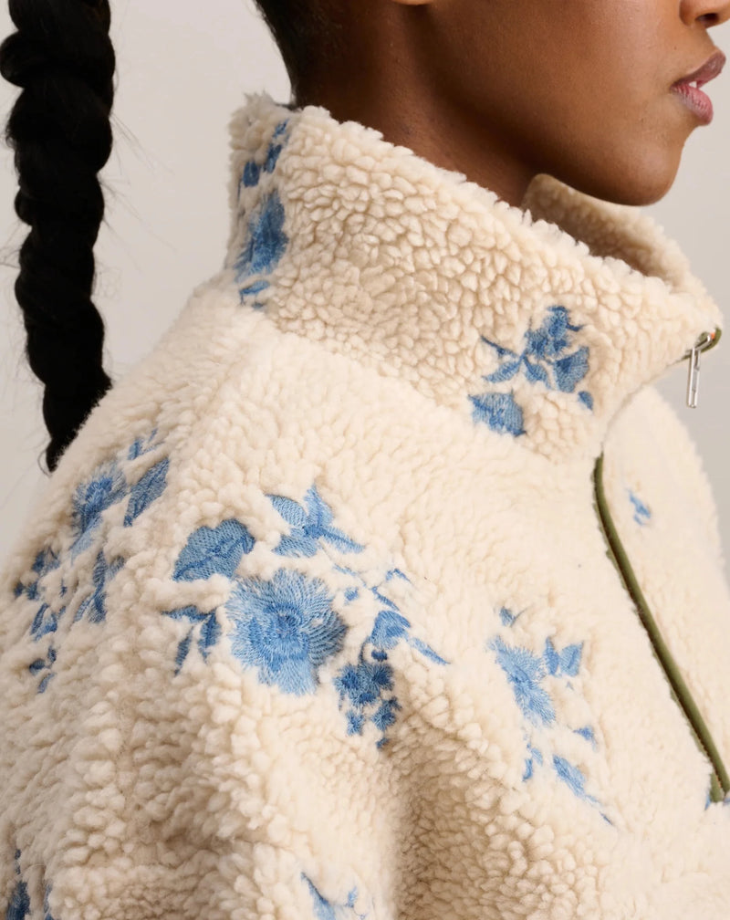 Crafted from warm teddy fleece with contrasting mesh lining and piping on the edges, it is detailed with embroidered frosted flowers in denim-like tones. Half-zipped raised collar, front pockets, and a dollop of rugged flair finish the look with style.