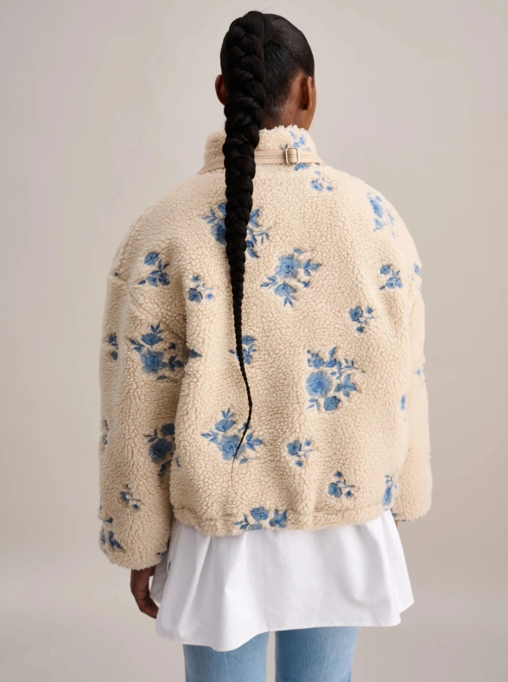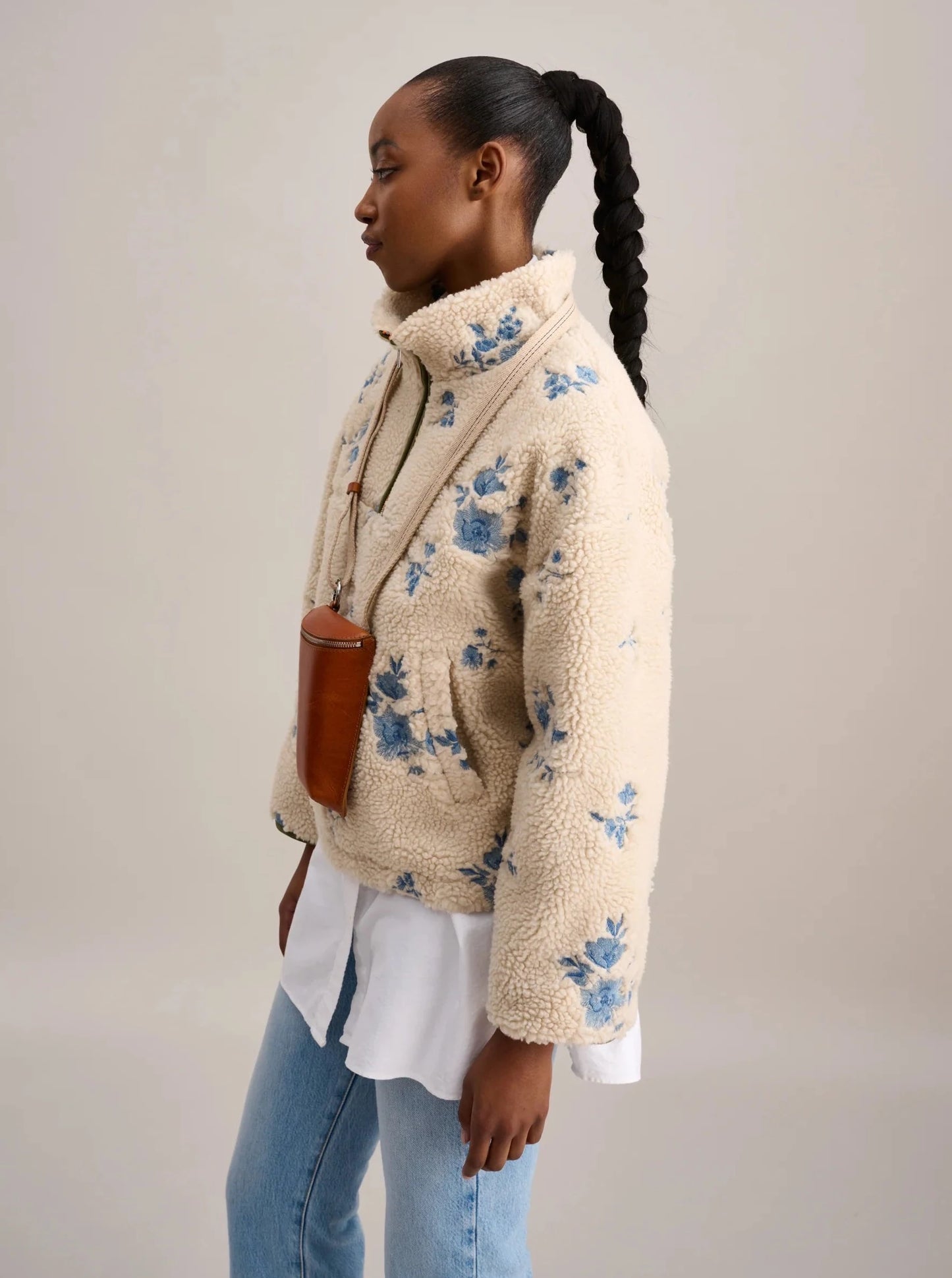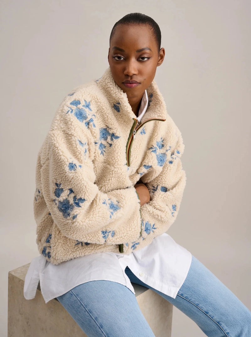 Crafted from warm teddy fleece with contrasting mesh lining and piping on the edges, it is detailed with embroidered frosted flowers in denim-like tones. Half-zipped raised collar, front pockets, and a dollop of rugged flair finish the look with style.