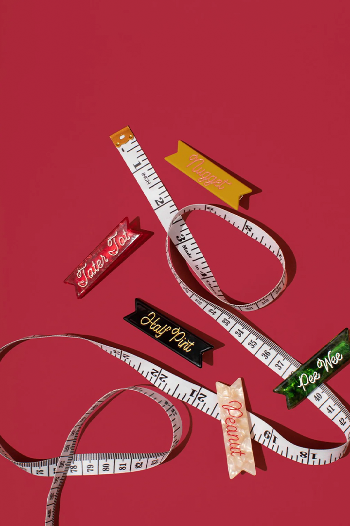 Emerald green acetate with ivory cursive ink inlay and gold alligator clip on back • 2 inches wide, 1/2 inch tall, comes on a 4x4 inch card back