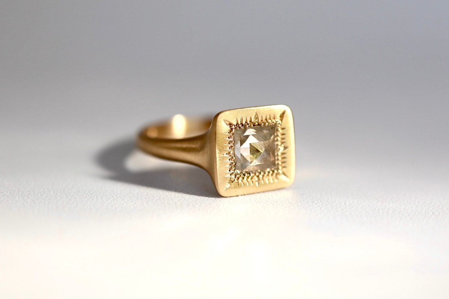 Handcrafted in Santa Fe, New Mexico, this elegant ring features a luminous 0.85 ct square rose-cut diamond set in warm 14K yellow gold. The soft, faceted surface of the rose-cut stone creates a gentle shimmer that highlights the diamond’s natural character and depth. Both modern and timeless, the piece reflects Sky Eyes’ philosophy of jewelry as armor for the body, mind, and soul.
