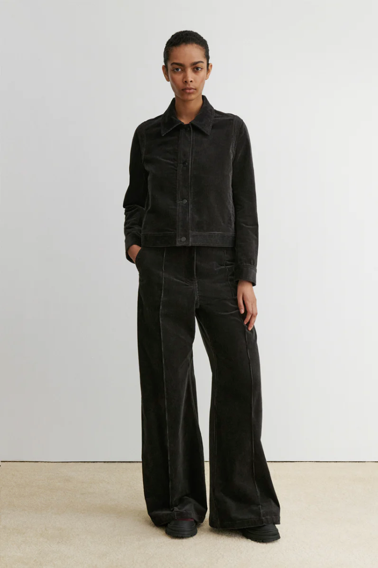 Boxy spread collar jacket with snap button closure in stretchy tailored cotton corduroy.
