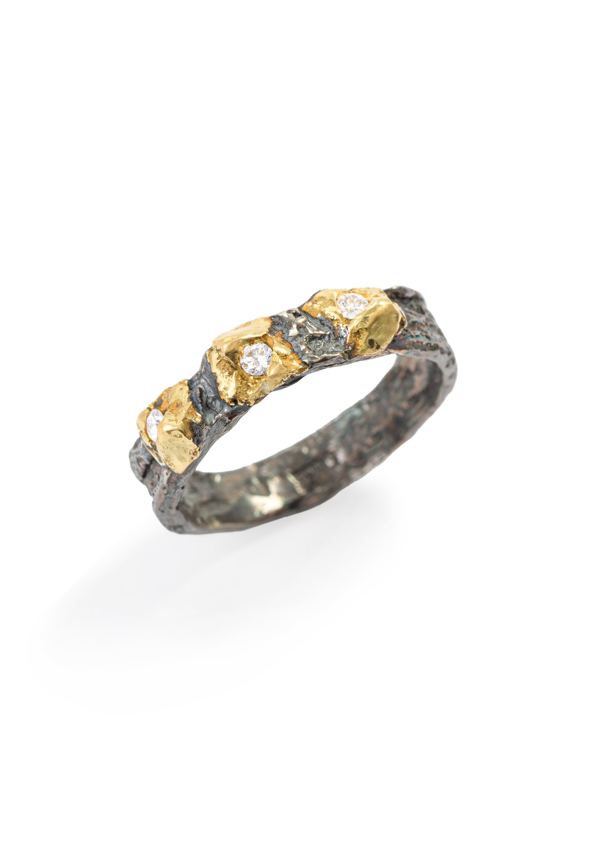 Emanuela Duca's signature blackened sterling silver ring with 3 white diamonds set in 18K gold.