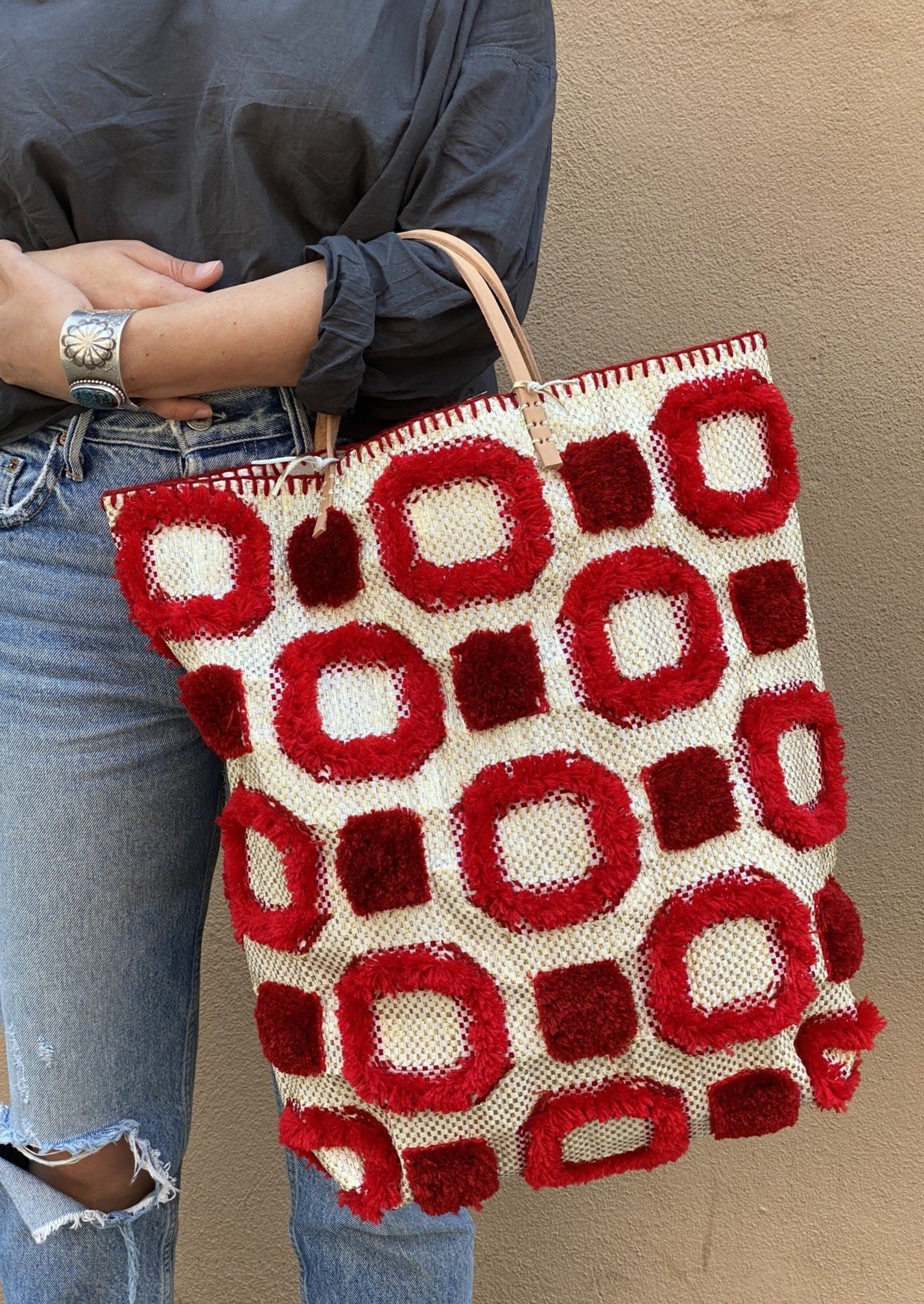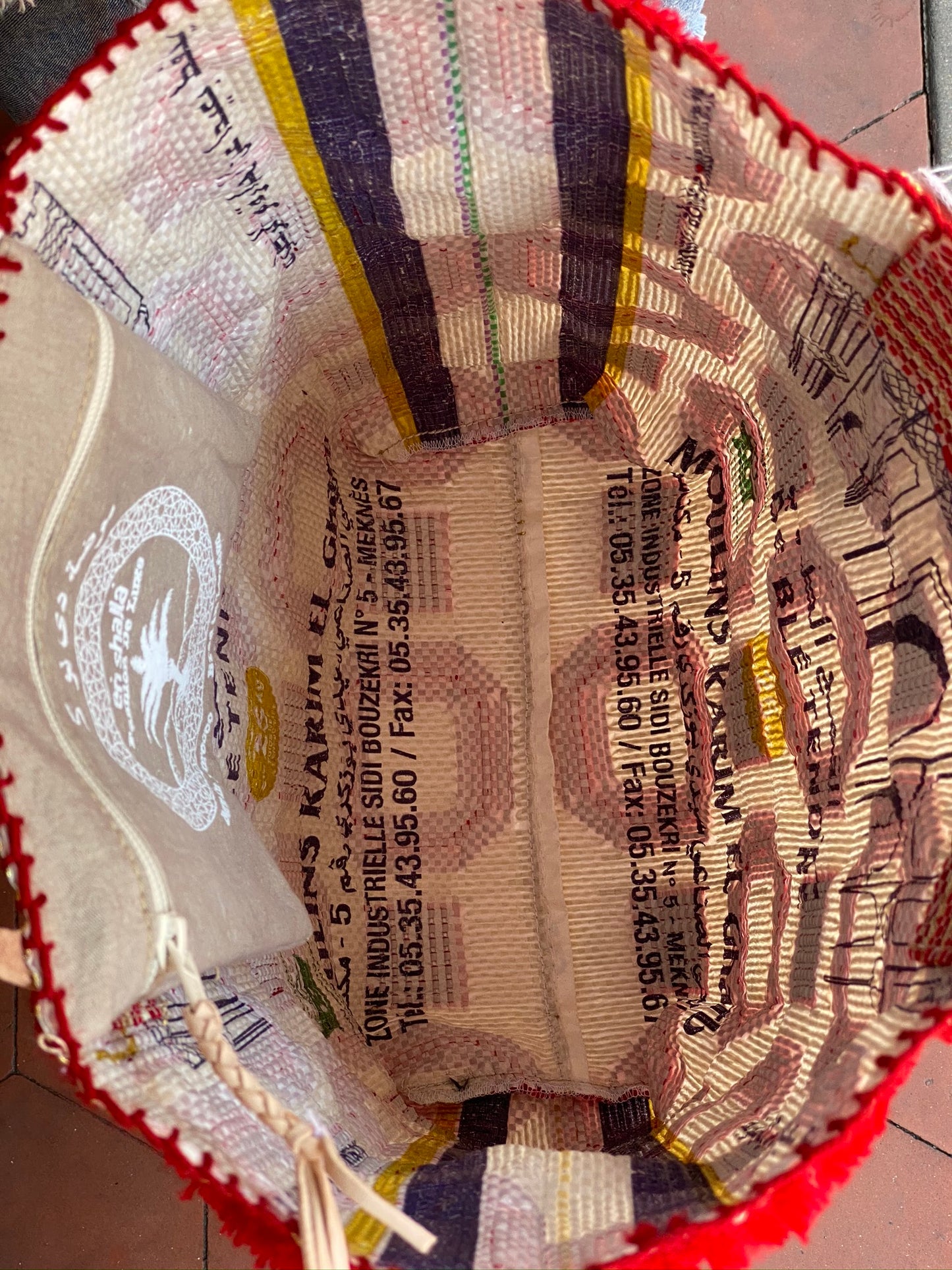 We work with recycled plastic bags that would have originally been used to carry industrial quantities of rice, couscous, flour and other commodity foods