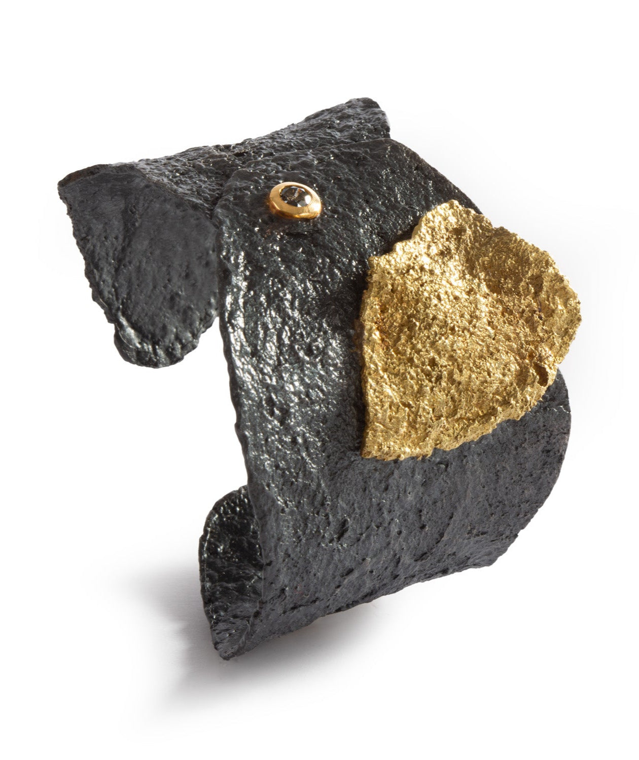 Emanuela Duca's Respiro cuff bracelet in blackened sterling silver, 18K yellow gold with one brown diamond (4mm) exudes a bold presence. This elegant and sophisticated piece of artful jewelry adds a touch of refinement to any outfit, making it a timeless accessory for various occasions.