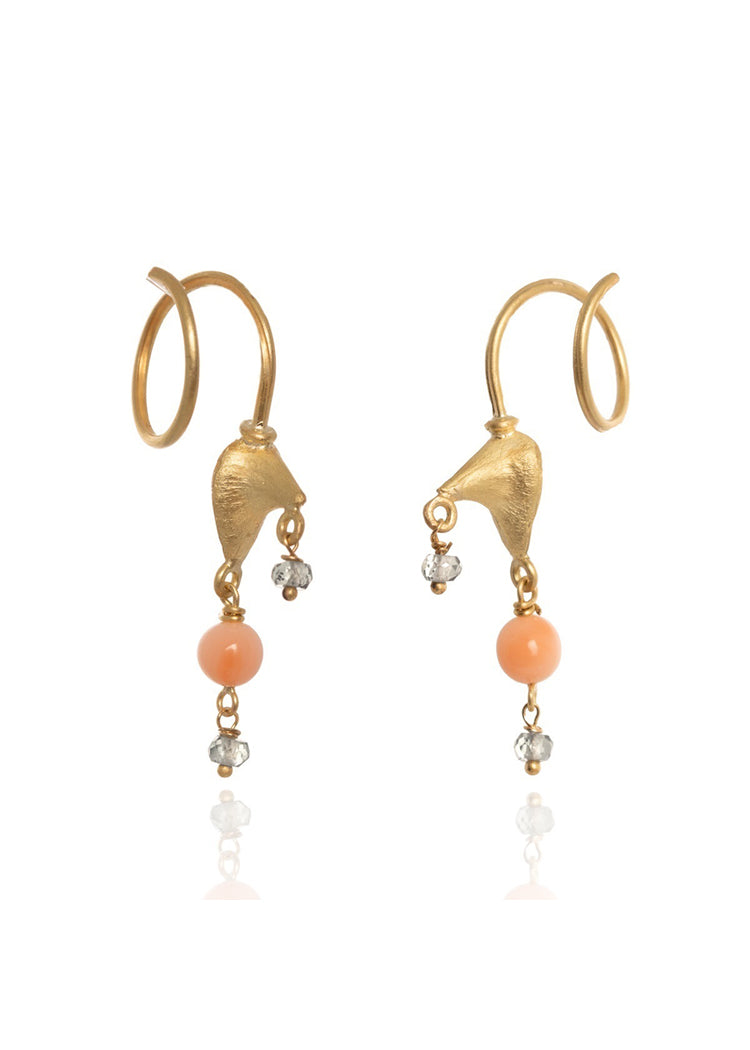 A rosethorn, carefully selected and picked in Lene's garden, is the inspiration behind this pair of earrings. They are dressed up with a coral and and finished with a sapphire raindrop diamond to give an extra sparkle.
