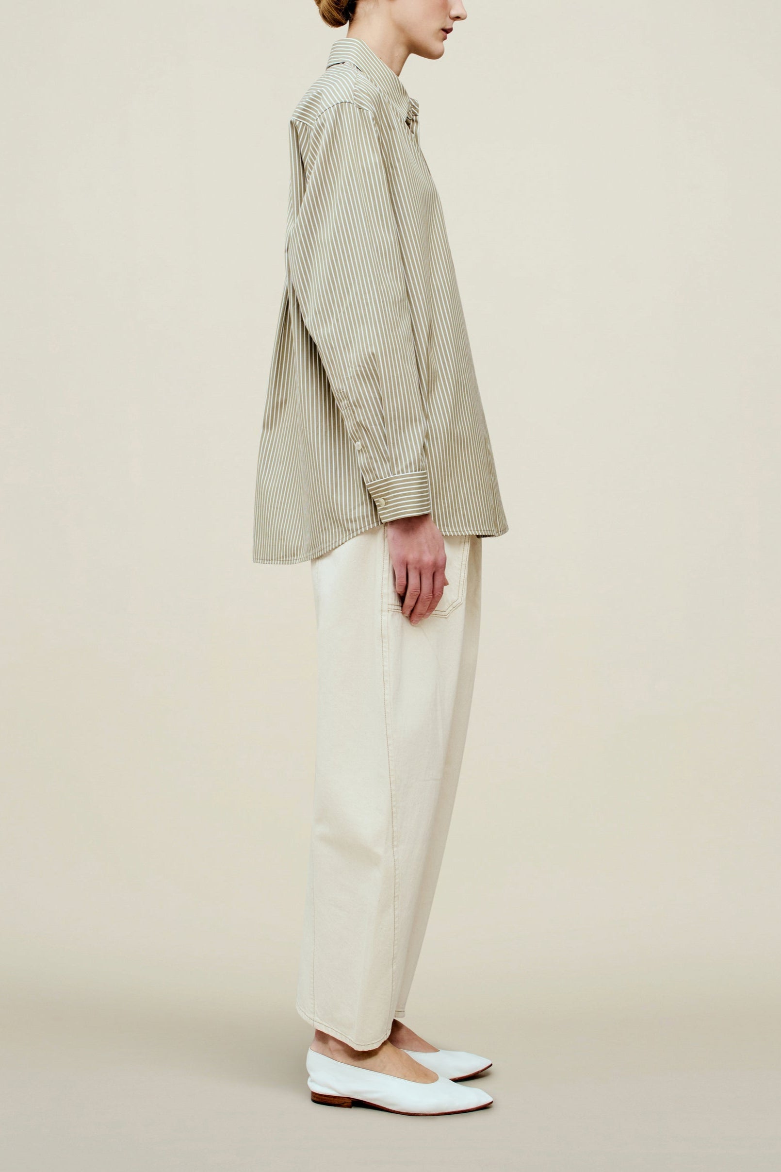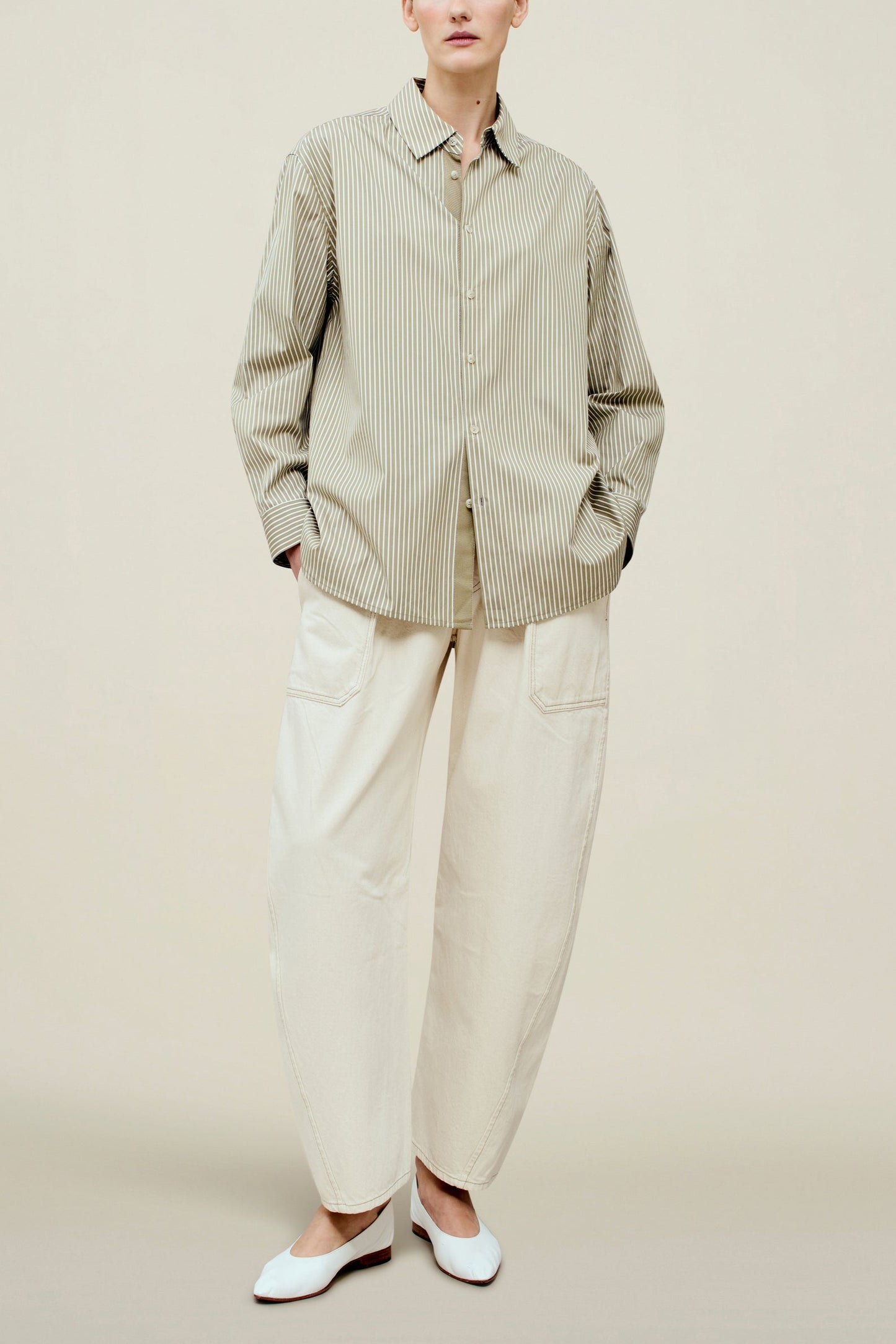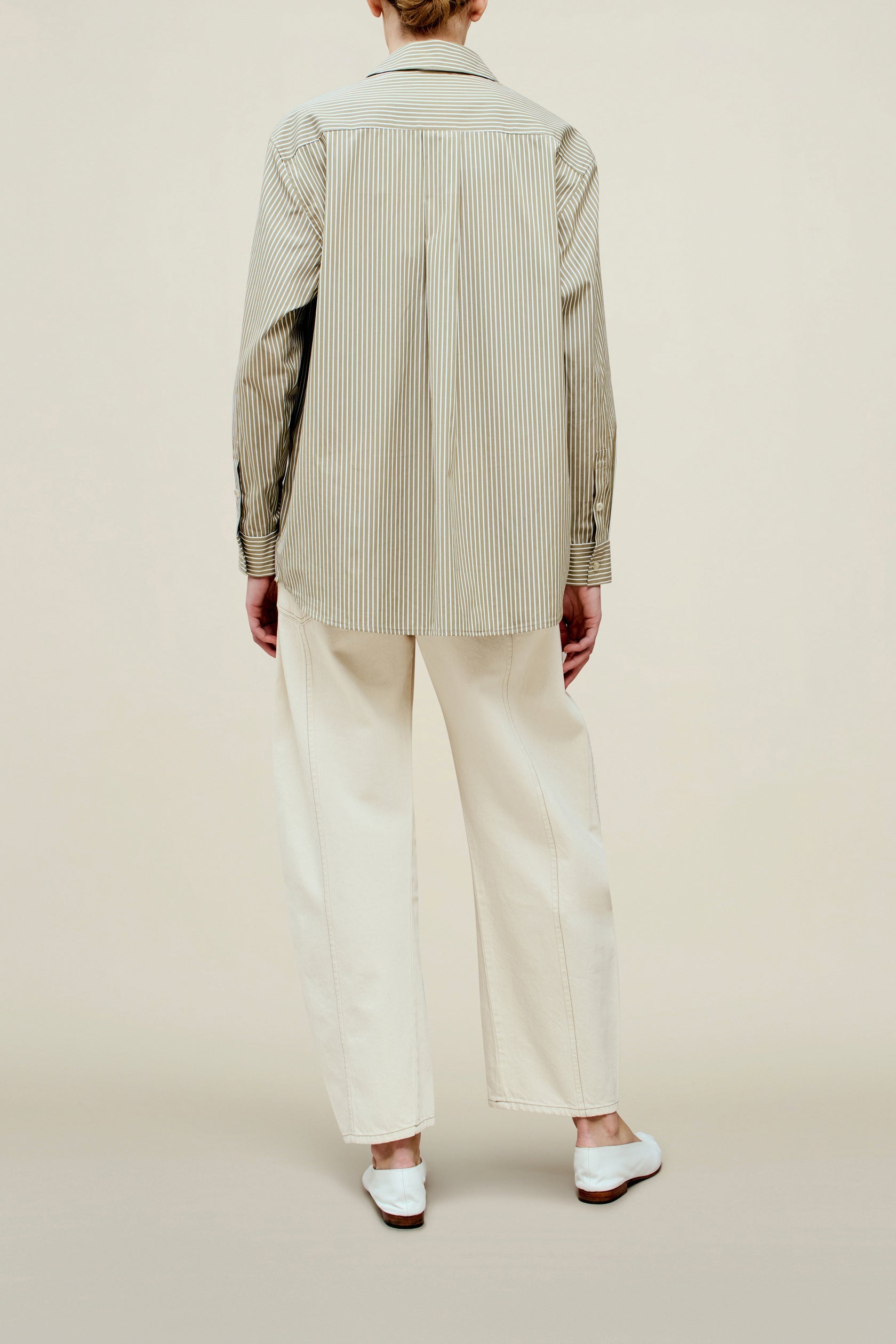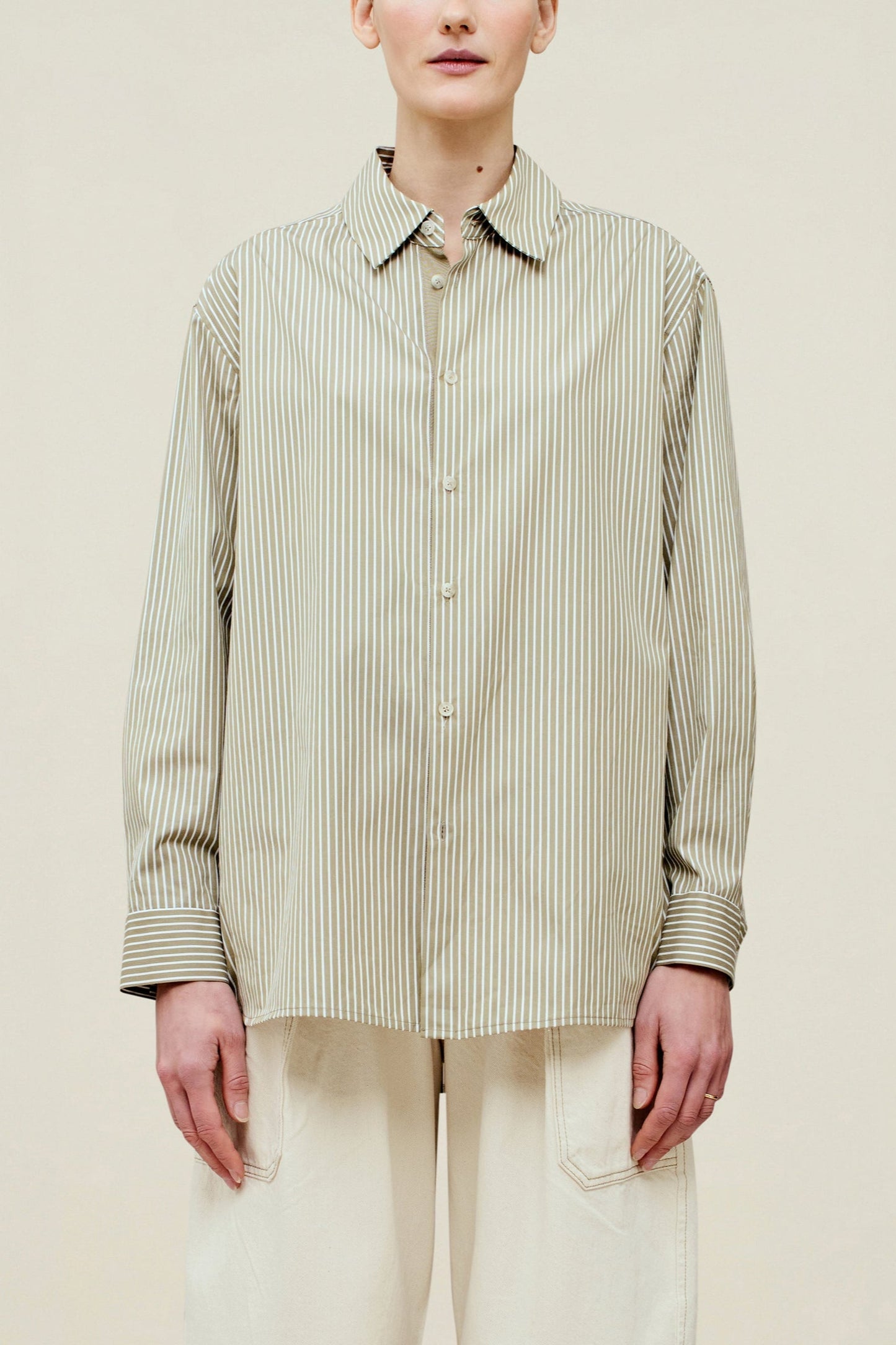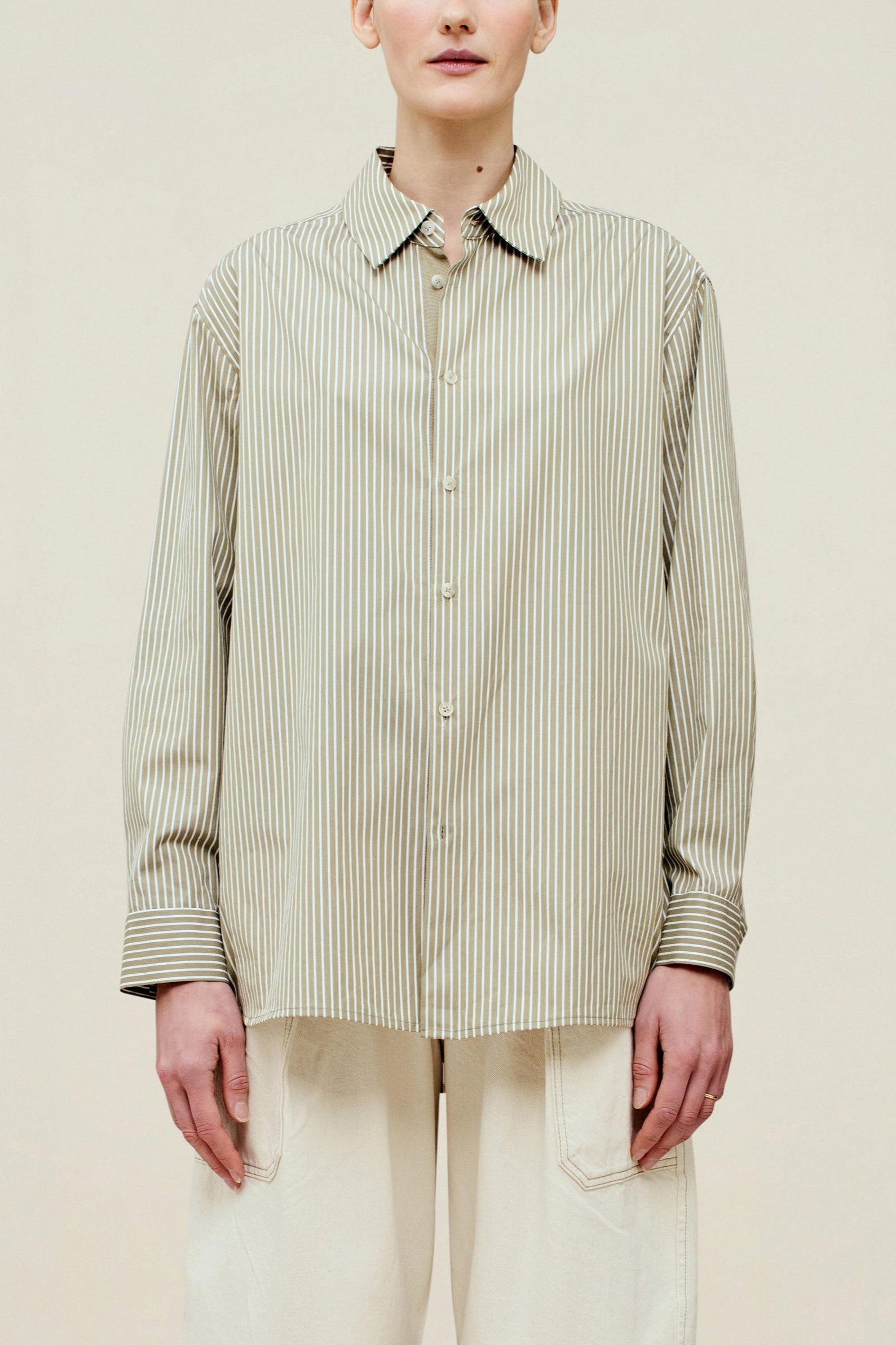 Boxy button down distinctly designed for all bodies, in our fresh striped poplin. Cool, wrinkle resistant cotton shirting, layers beautifully under and over any wardrobe, and transitions from season to season with its easy fit and sharp details. Classic shirt buttons on a tonal grosgrain placket detail.