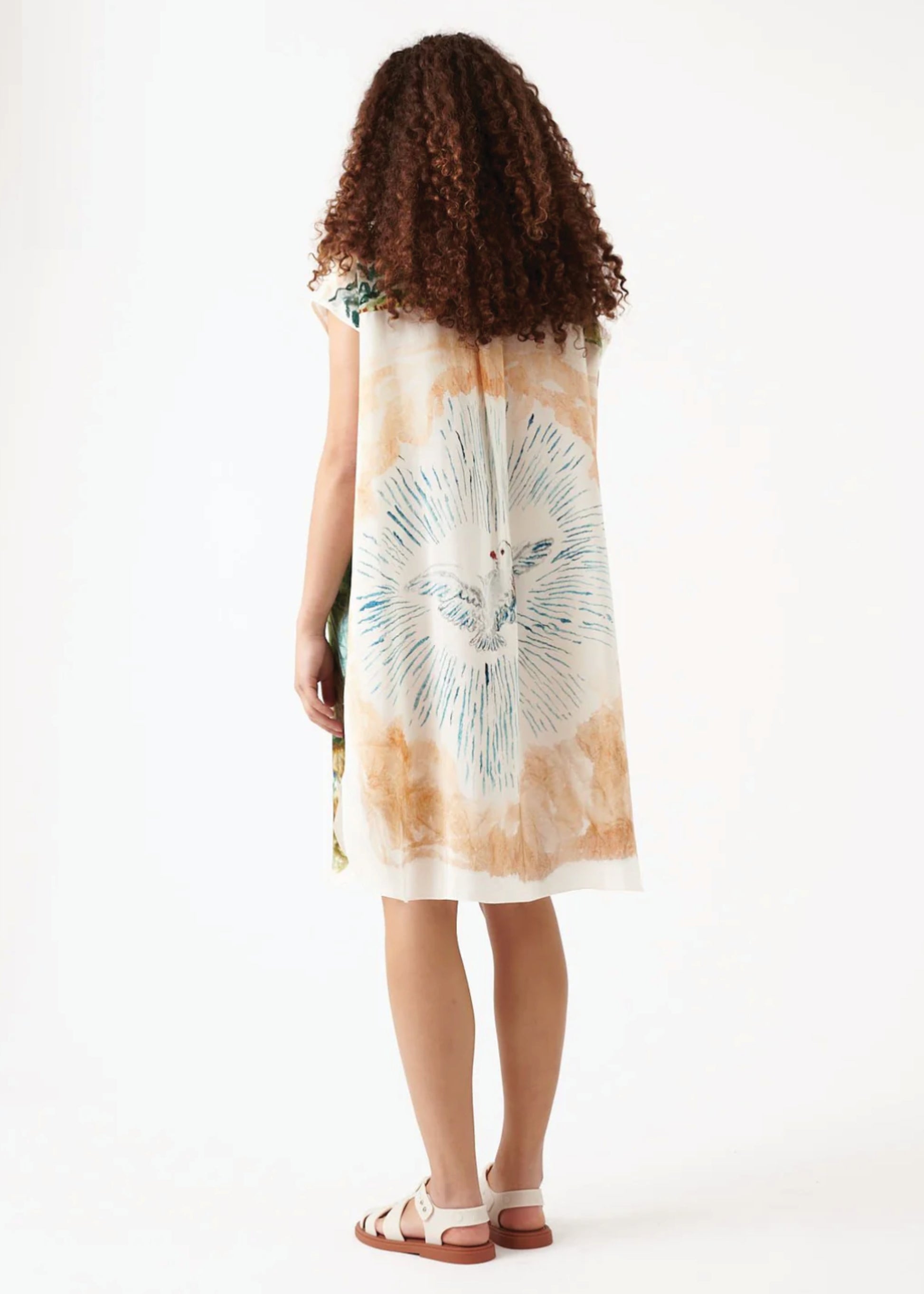 Crafted from 100% Organic Silk, Anntian's Sleeveless Shirt Dress features a hand painted landscape. This straight fit with side slits can be worn as a dress, tunic or unbuttoned overcoat. One size.