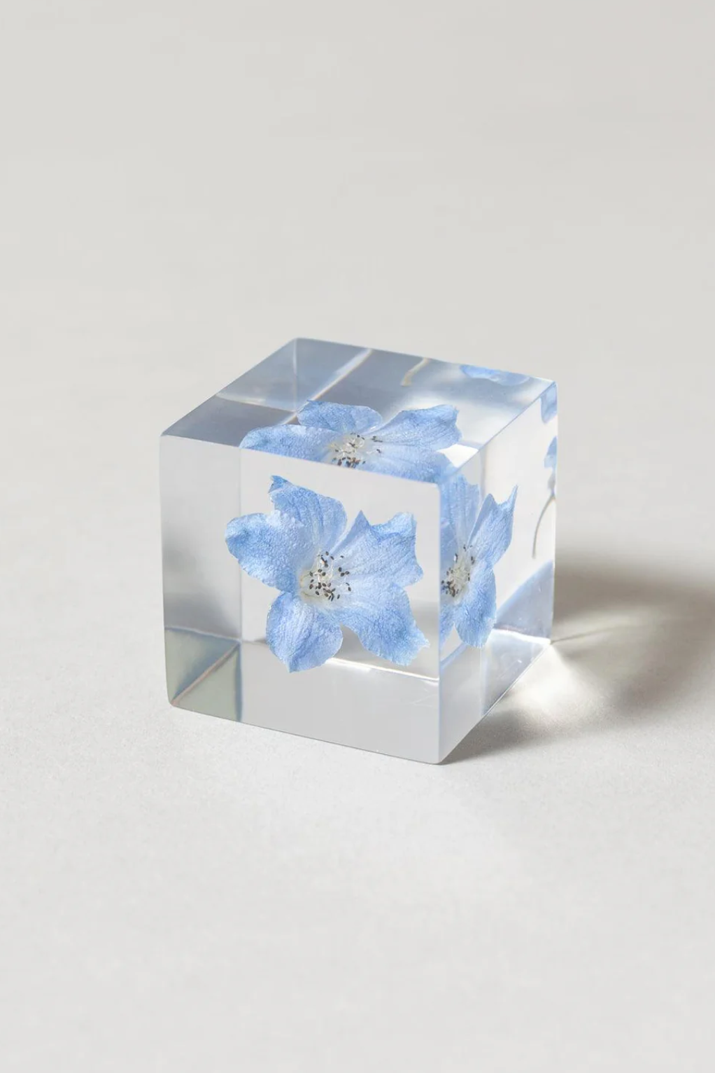 Designed to cultivate our inherent sense of wonder and exploration, Sola Cubes feature rare natural specimens captured forever in clear acrylic. Hyper-polished and distortion-free, these expertly preserved curiosities make a fantastic gift for the naturalist in your life and will captivate guests at your home and office. This cube holds a flower from the Siberian larkspur plant.