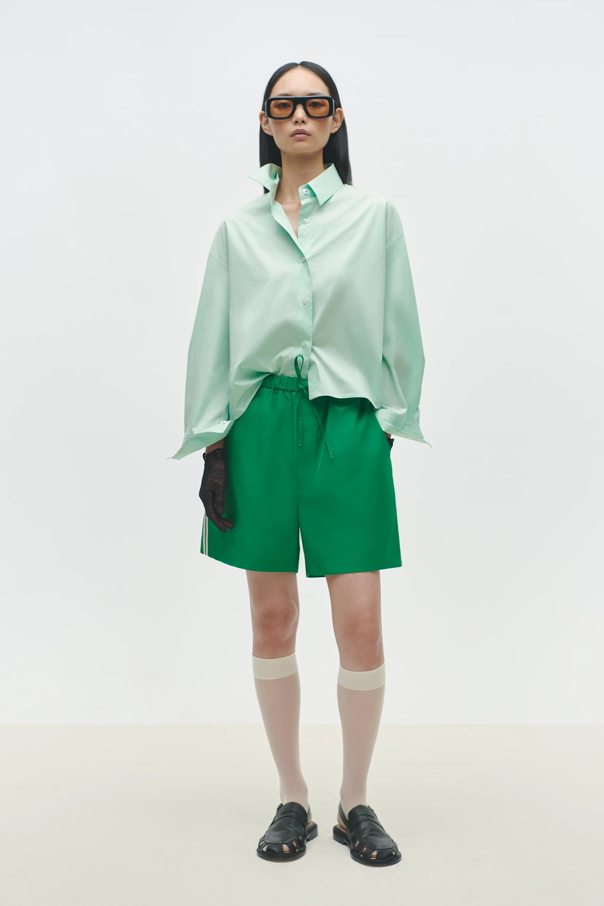 These sporty shorts have a swimwear-inspired design with a masculine touch. They come in a vibrant green color that really stands out. Featuring two contrasting fine white stripes on the sides, they also include side pockets and a faux fly for added detail. The drawstring waistband ensures a comfortable and adjustable fit, making them perfect for both active days and casual outfits with a shirt.