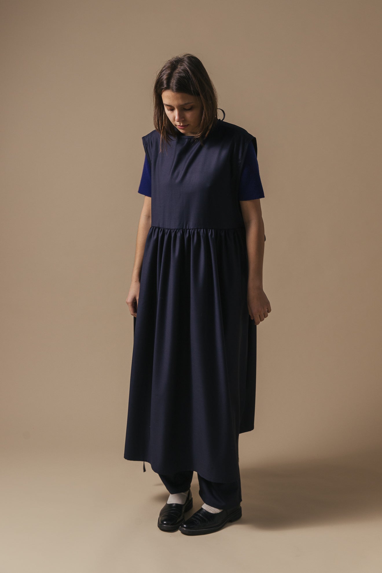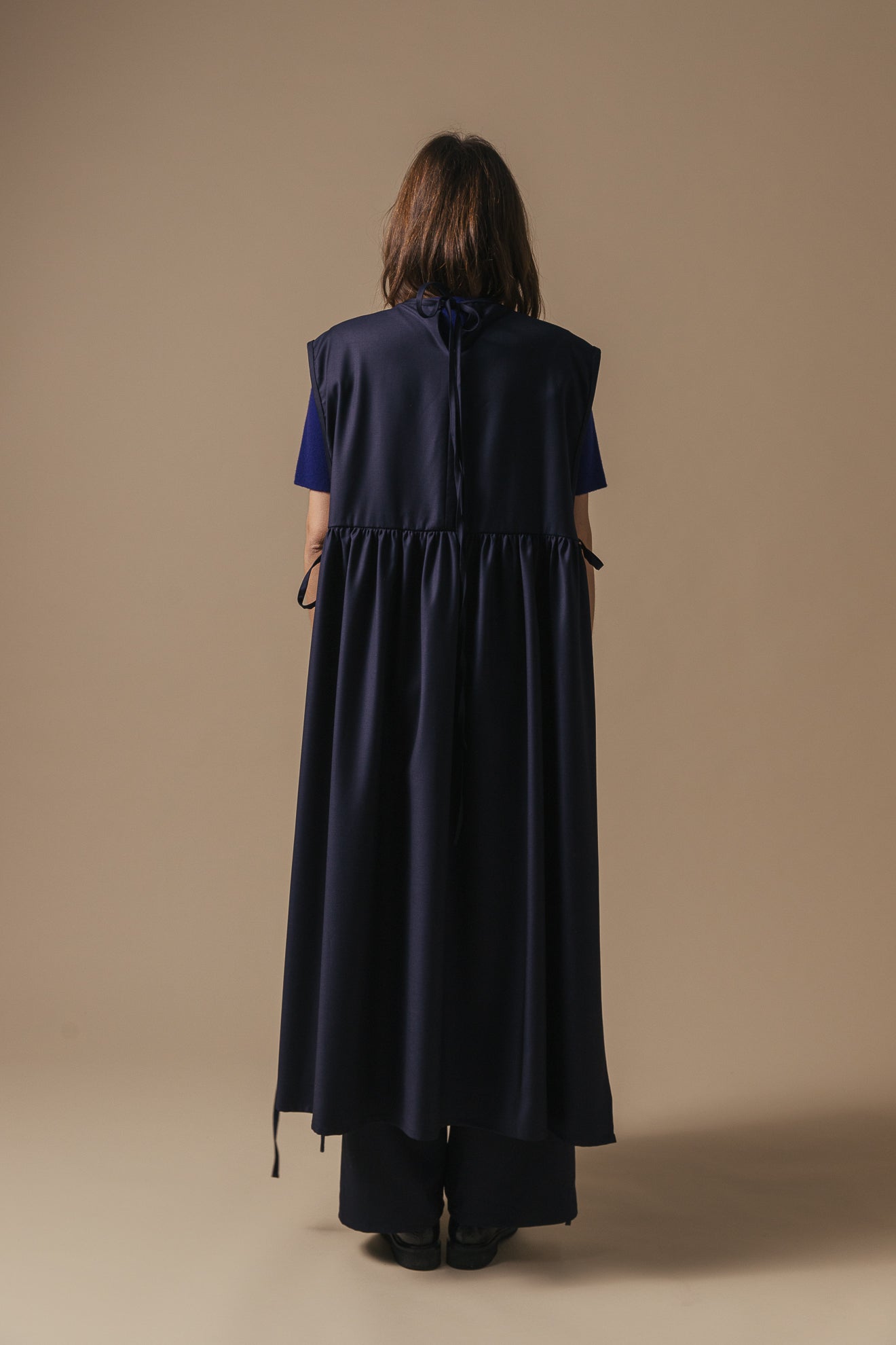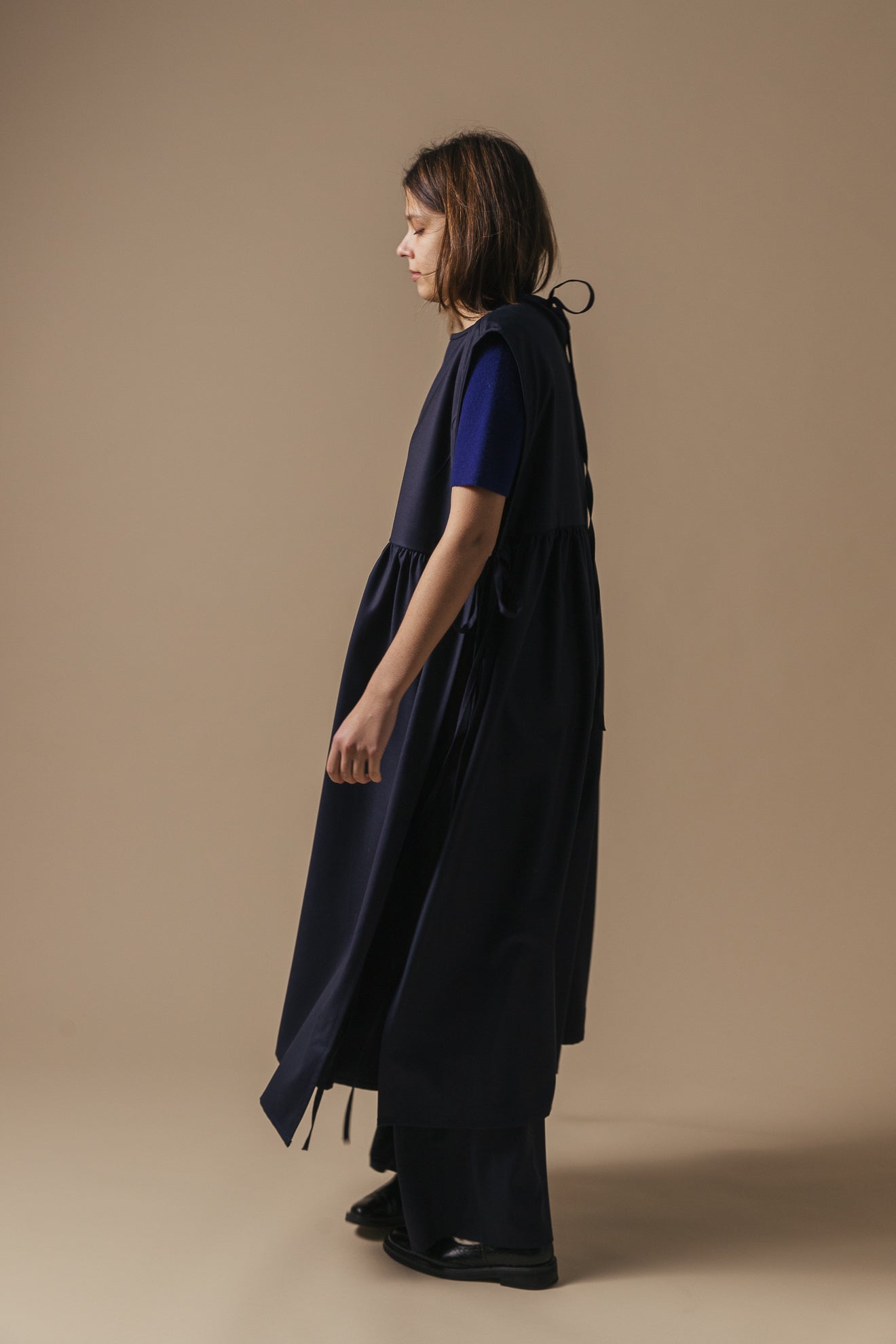 Navy vest dress perfect for layering over a navy poplin pant or denim.
