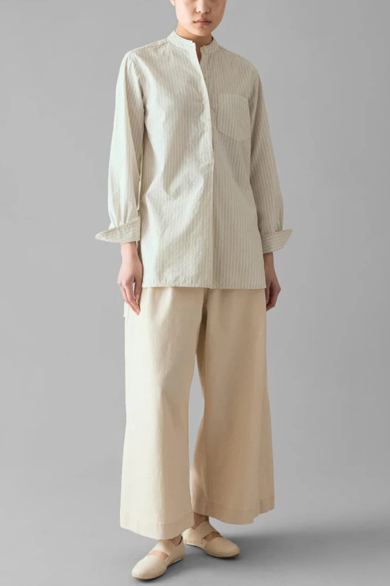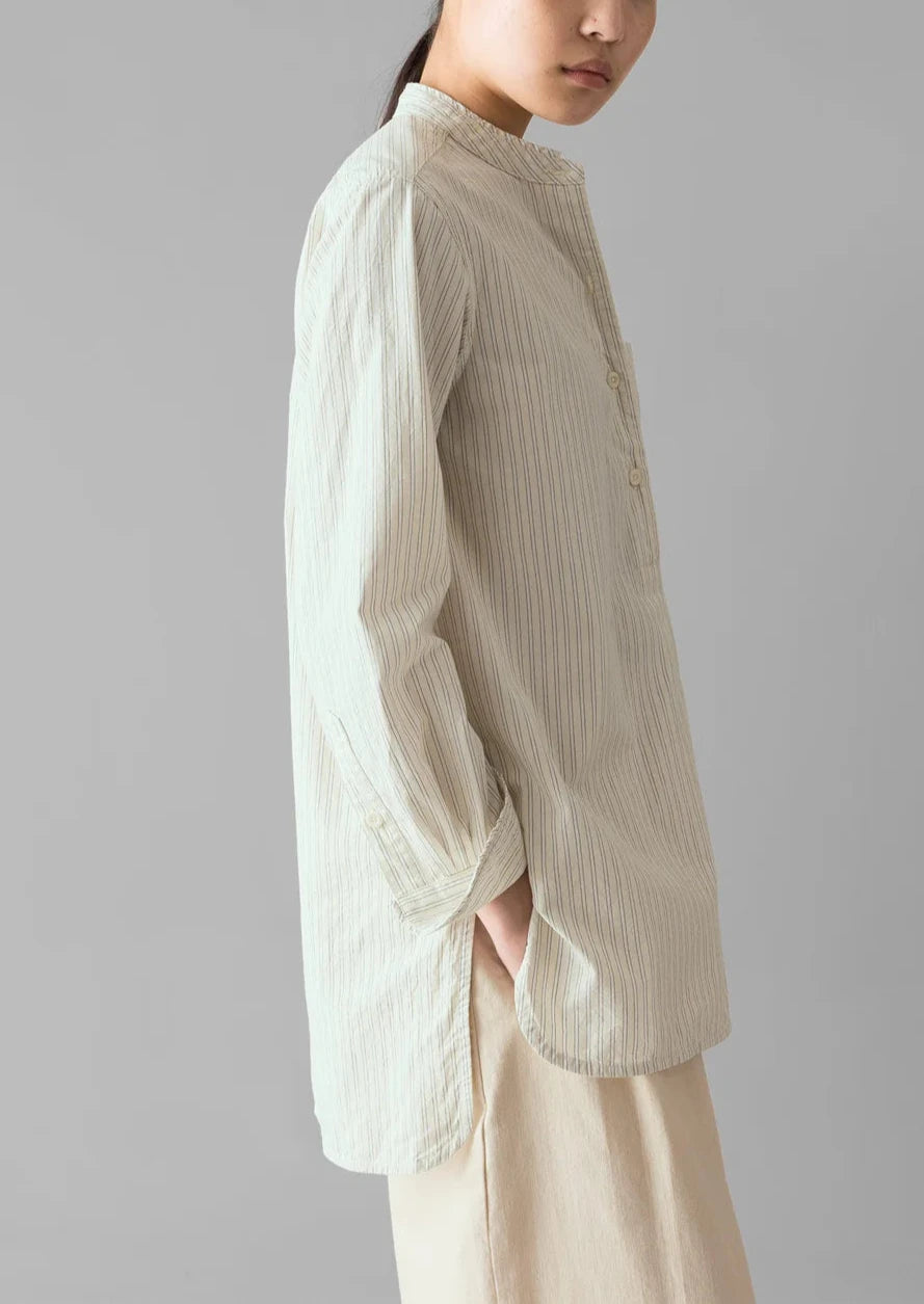 The Taro Shirt is cut to a longer length for effortless layering. Crafted from striped cotton with a pleat beneath the half button placket, for movement through the curved step hem.