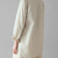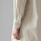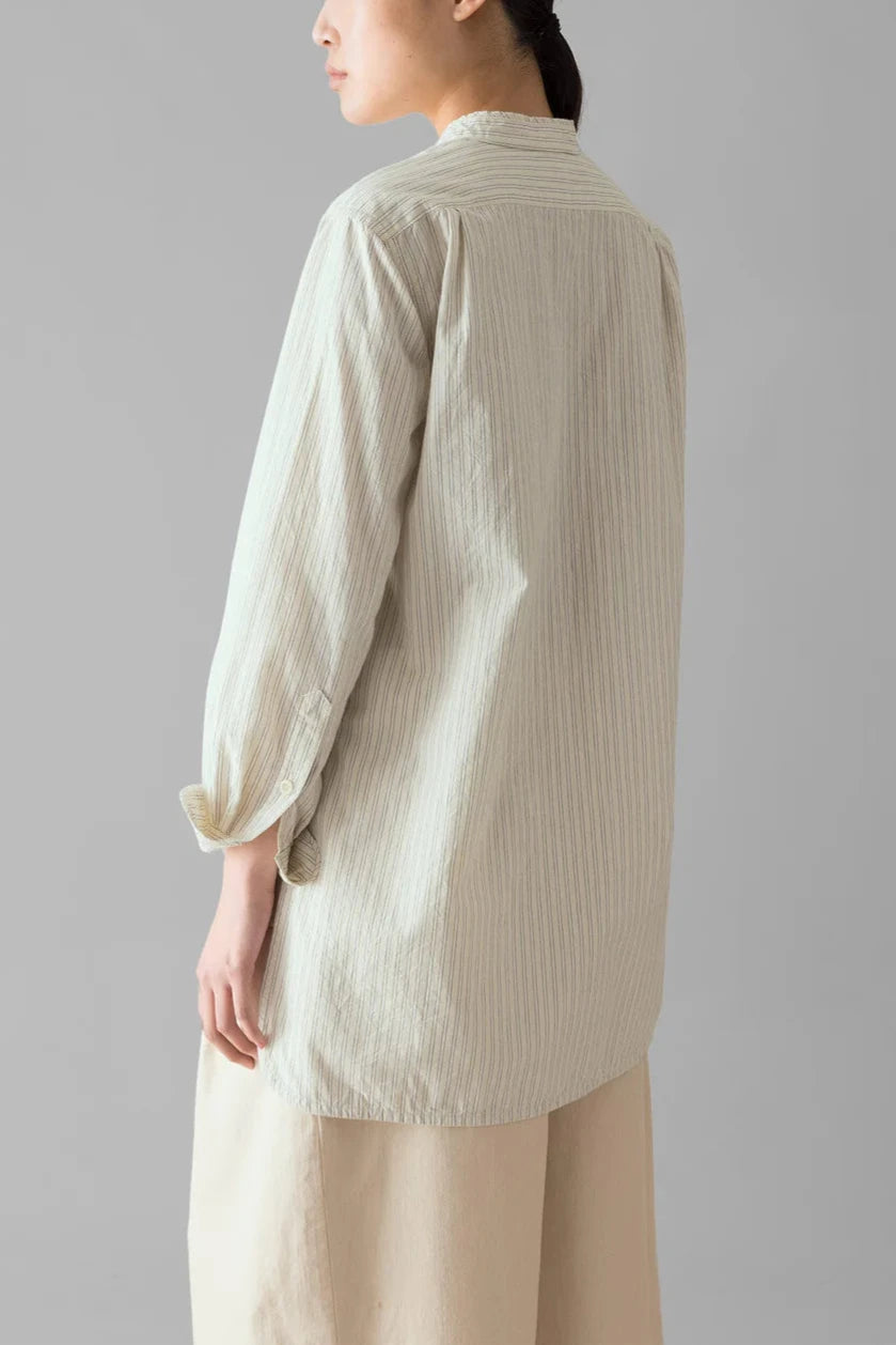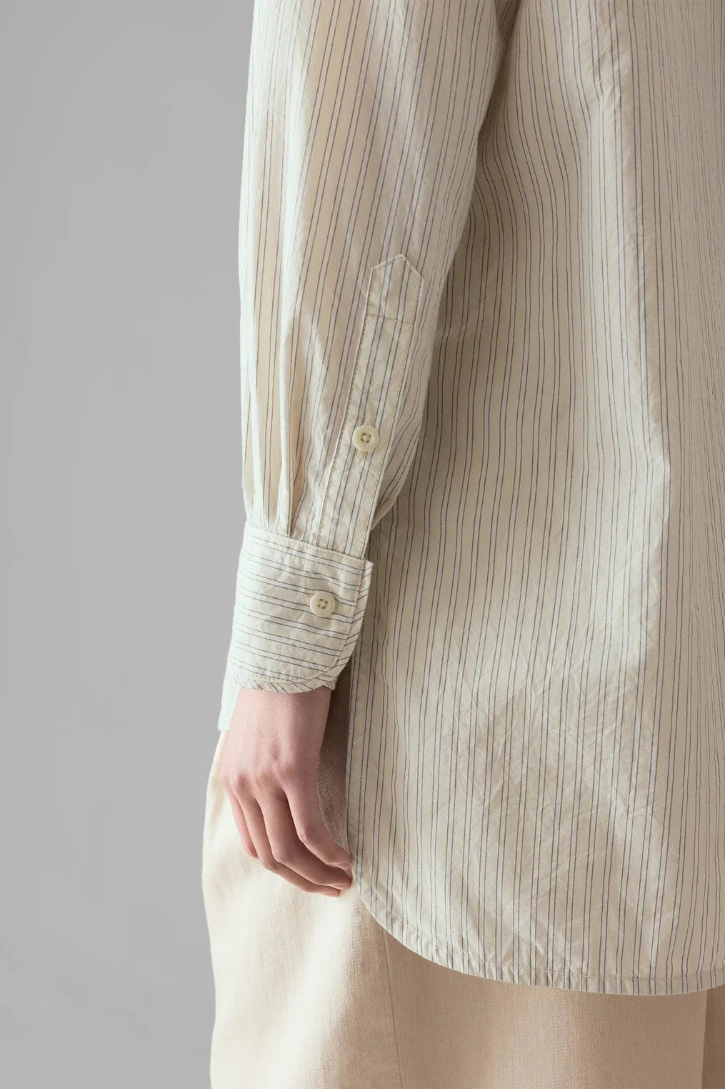 Striped cotton. Long cut. Grandad collar. Chest patch pocket. Gathered cuffs. Front pleat. Curved step hem. Top-thigh length. Concealed-button half placket.
