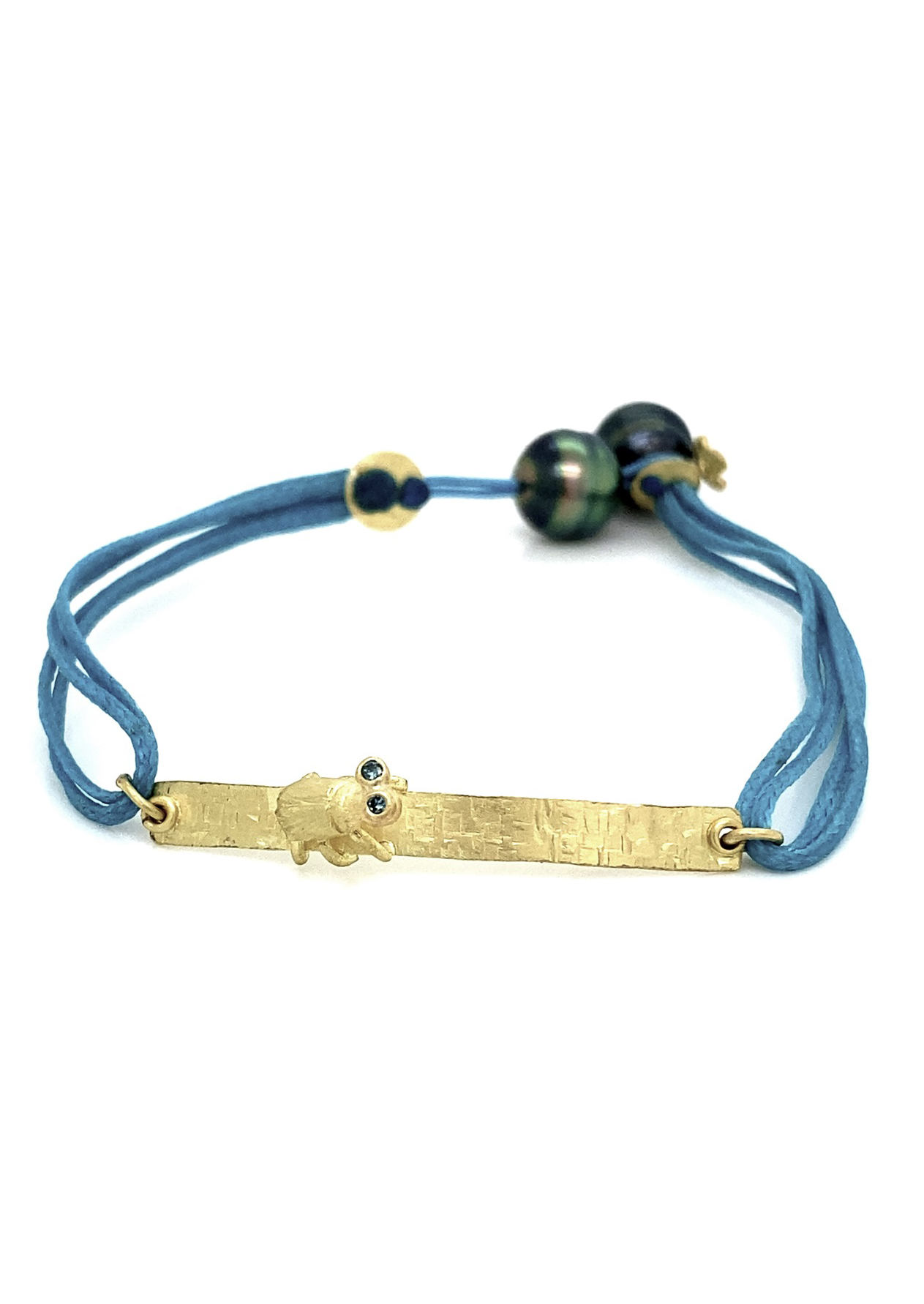 Handcarved 18k yellow gold, .02ct blue diamonds, Tahitian Pearl on an adjustable nylon cord