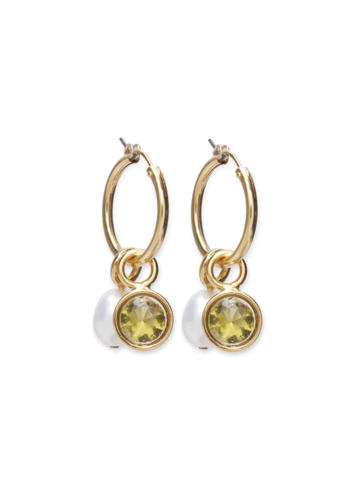 Vermeil hoop earrings with removable freshwater pearl and olive-colored glass charms.