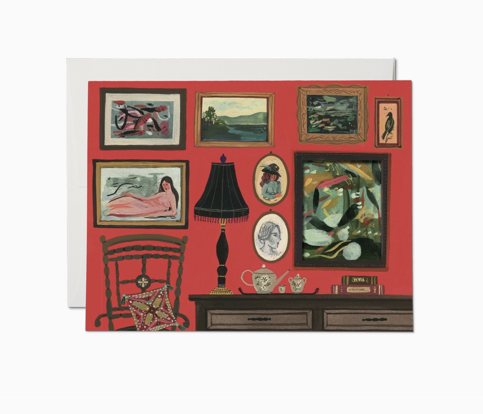 Folded Italian paper. Offset printed and foil stamped. 4.25 x 5.5 inches. Illustrated by Becca Stadtlander. Printed by Red Cap Cards in Los Angeles, California, USA.